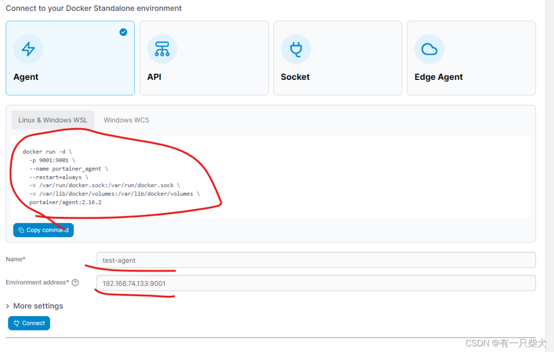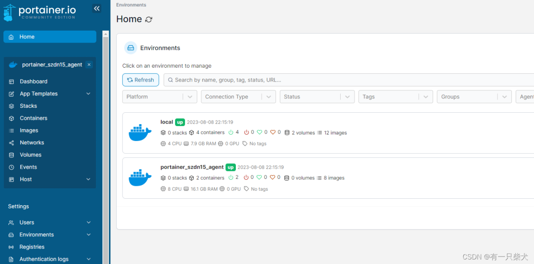 在远程主机上运行上面的 docker agent 命令,启动后。下方的 Environment address 输入远程主机 IP:9001 端口,点击 Connect。成功连接上去后,在 Home 下就多了一个 Docker 管理项: