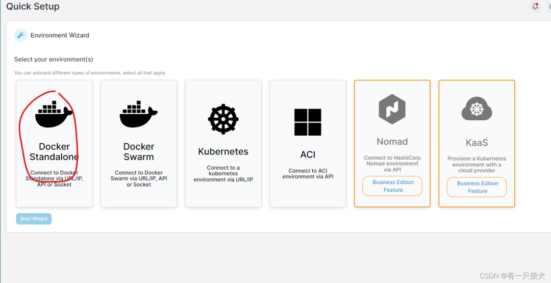 由于我们使用的是单机版的 Docker,所以选择第一个,点击 Start Wizard。