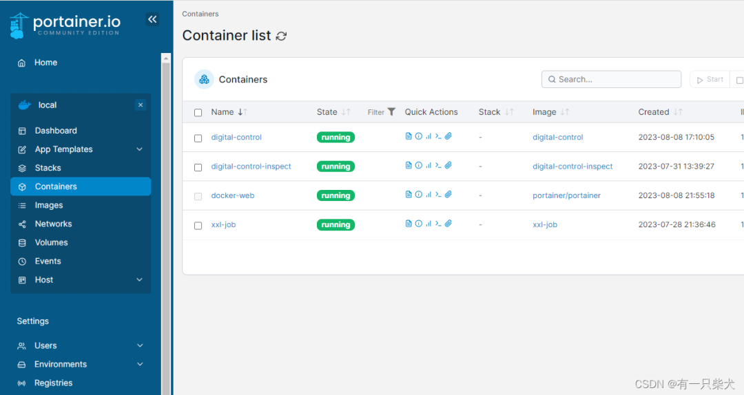点击 Containers,依然可以看到我们启动的几个容器。点击容器详情,也可以查看我们的容器基础信息,同时也可以进行容器管理操作。