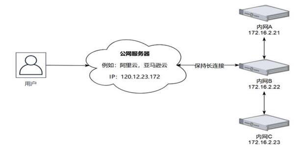用户访问我们的内网服务,本质上是通过了公网服务器这个桥梁。因为这个公网服务器是有公网IP的,而公网服务器和内网的服务器持久保持联系。所以,当用户有请求发送时,公网服务器将请求转发到我们的内网,内网再将响应回复给公网服务器,公网服务器将响应回复给用户。