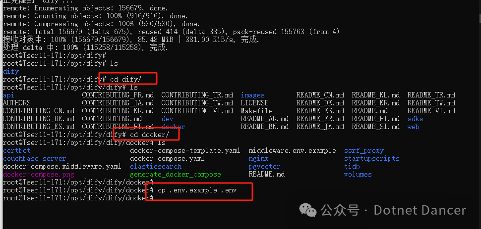 进入到dify目录下的docker文件夹下,复制一份示例配置到 .env