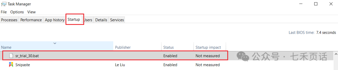 然后需要将 sr_trial_30.bat 这个批处理文件放到自启动的文件夹 %AppData%\Microsoft\Windows\Start Menu\Programs\Startup 里,查看自启动中出现批处理的任务后每次开机就会自动运行删除SecureCRT的注册信息了: