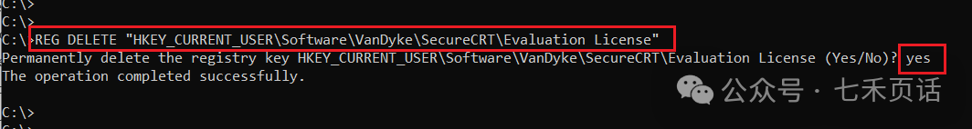 更快捷的方式是通过命令行直接删除,打开CMD之后输入 REG DELETE "HKEY_CURRENT_USER\Software\VanDyke\SecureCRT\Evaluation License" ,然后 yes 确认即可: