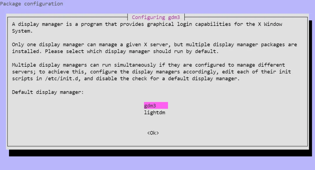 sudo apt install lightdm安装新的显示管理器会跳出对话框,选择要用的显示管理器