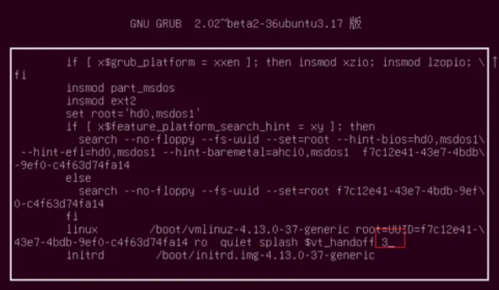 第二种方式是系统启动时按ESC,在显示Grub启动菜单时,按e编辑启动项,在在内核参数行末尾给出引导运行级别3(多用户模式,纯文本):