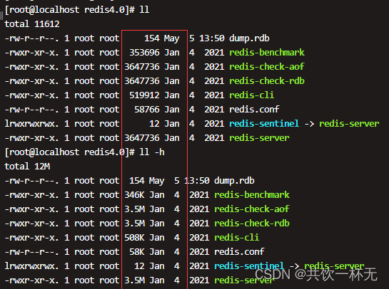 使用ls -l,会显示成字节大小,ls- lh会以KB、MB等为单位进行显示更加直观。