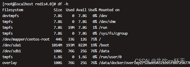df = disk free,命令用于显示磁盘分区上的可使用的磁盘空间。默认显示单位为KB。可以利用该命令来获取硬盘被占用了多少空间,目前还剩下多少空间等信息。