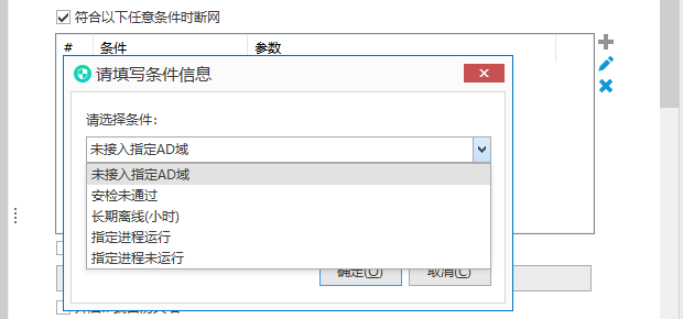 终端防火墙功能可根据多种安全条件自动触发断网机制。例如:终端未接入指定AD域、安全检查未通过、设备长期离线(可设定小时数)、指定进程未运行,或指定进程运行(如远程控制软件),系统将自动切断网络。