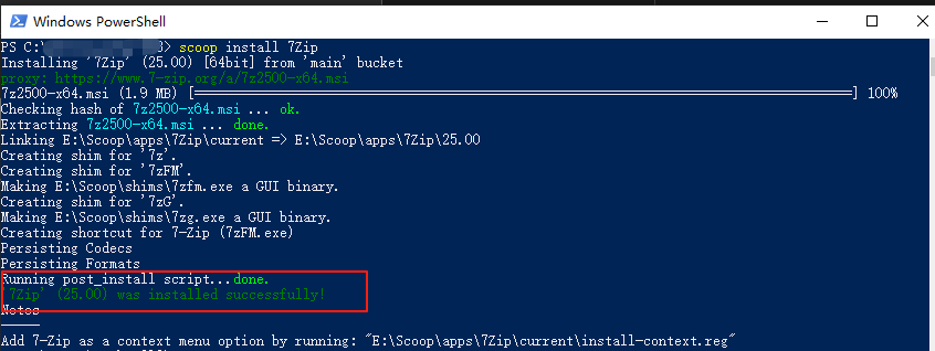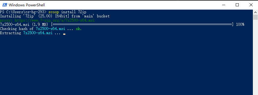 scoop install 7Zip安装进行中的效果如下图: