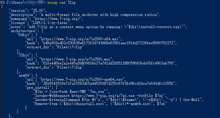 Scoop 的工作原理基于 PowerShell 脚本,通过指定 JSON 格式的 manifest 文件来描述软件包获取、安装和配置方法。单个软件支持安装多个版本。