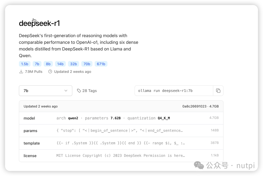 打开Ollam[4]a 模型库[5] ,你会看到丰富多样的 DeepSeek-R1 模型版本,如 1.5B、7B、32B 等。根据自身电脑硬件配置来选择合适的模型版本至关重要。