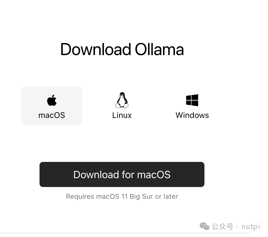 我这里以 mac 和 windows 为例,如果大家安装不了,也可以在我的公众号 nutpi 回复“Ollama”获取快速下载链接。