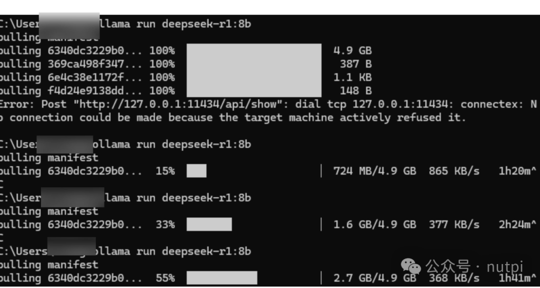 确定适合自己电脑配置的模型版本后,就可以开始下载和运行模型了。打开终端或 CMD 命令窗口,输入对应的运行指令: