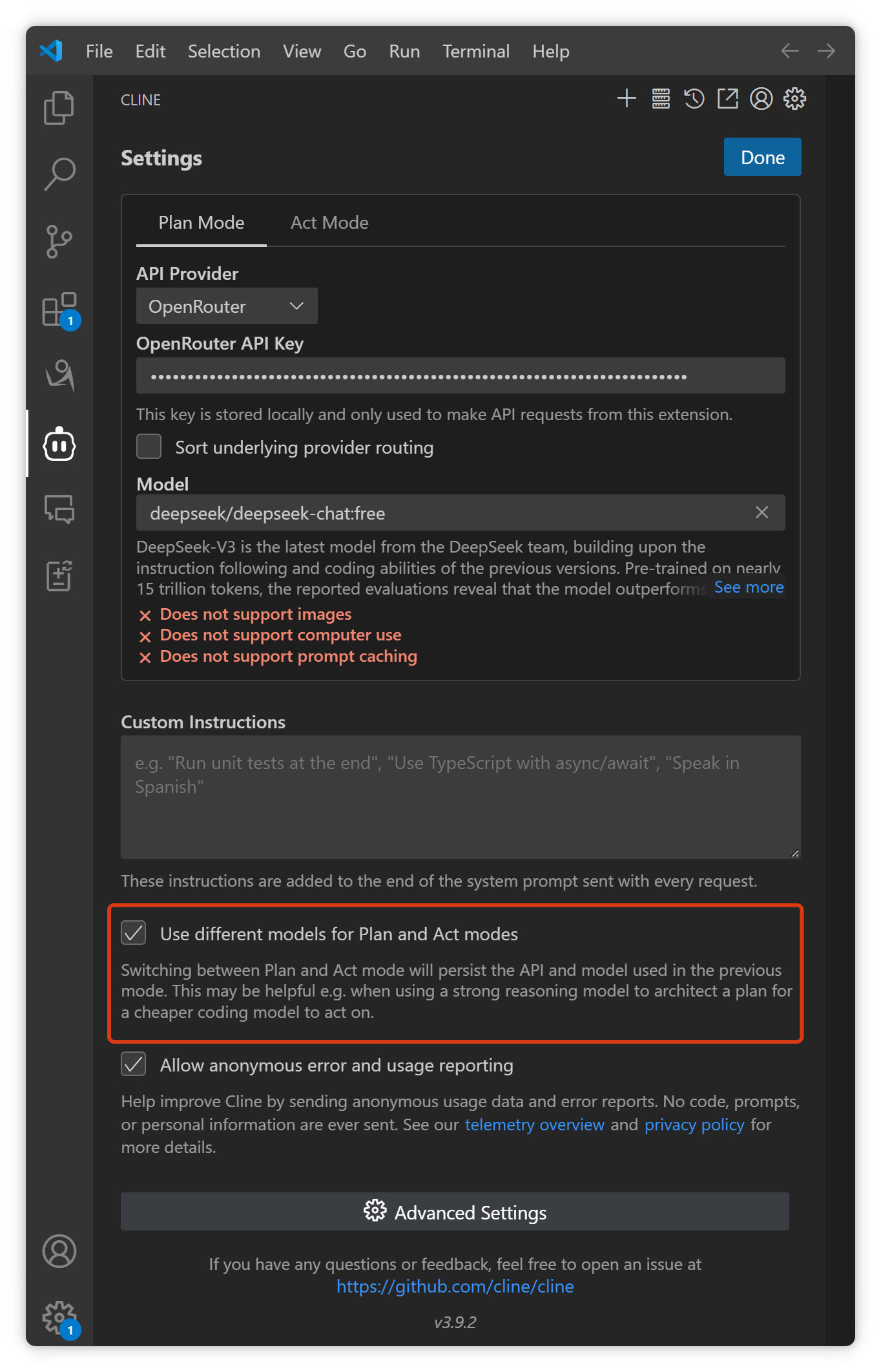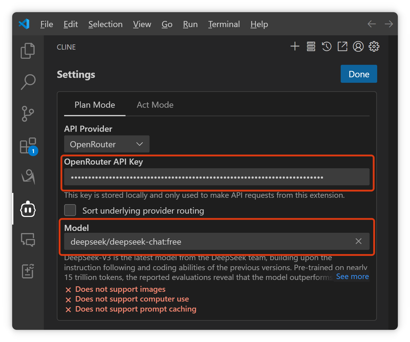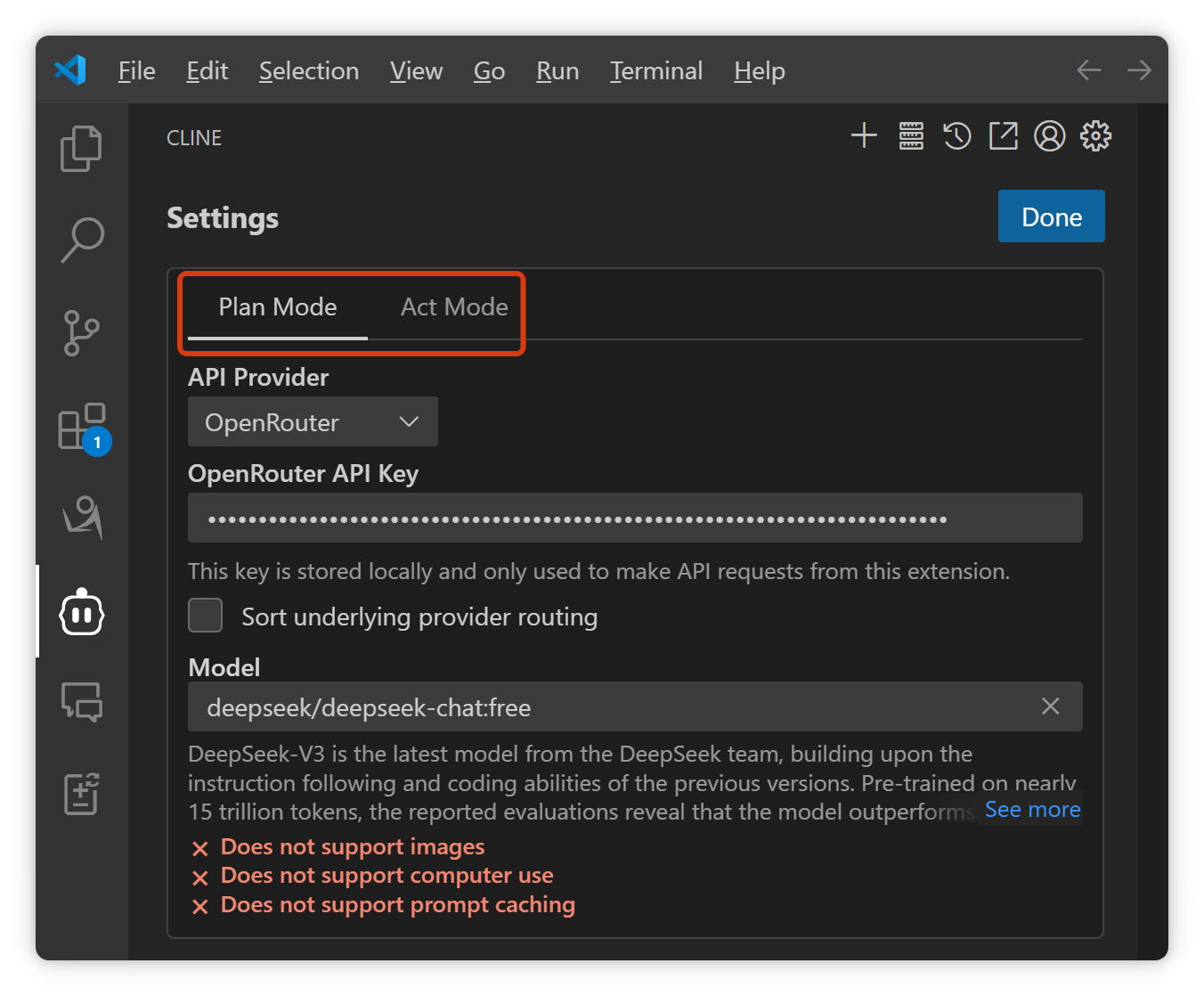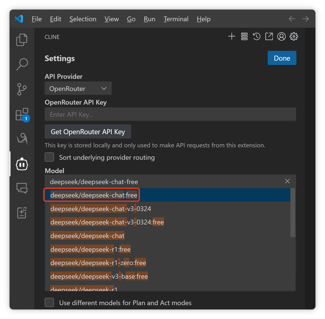 为 Plan 模式 和 Act 模式 分别配置 OpenRouter 的 API Key。例如,您可以统一使用免费的 DeepSeek 模型,但后续可以根据自己的实际需求进行调整。在写代码时,可以为 Act 模式 配置 Claude 模型,而为 Plan 模式 配置 ChatGPT 模型。这样,您可以充分利用各个模型的优势,提高 工作效率 和 智能辅助体验。