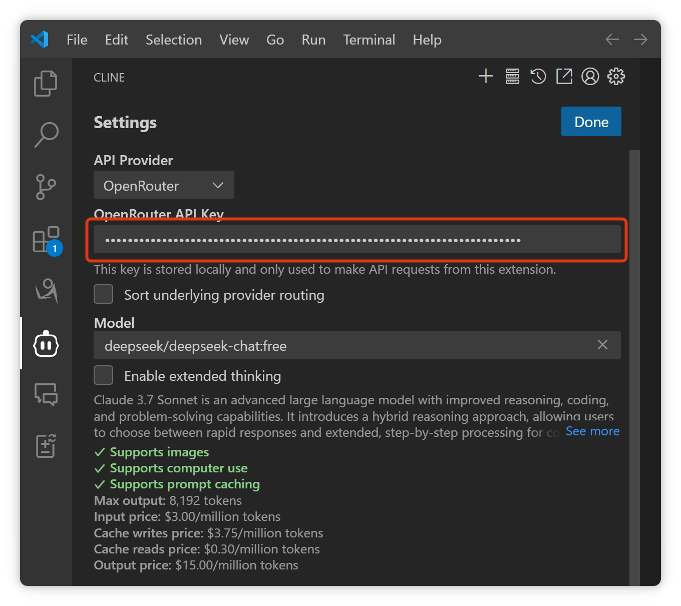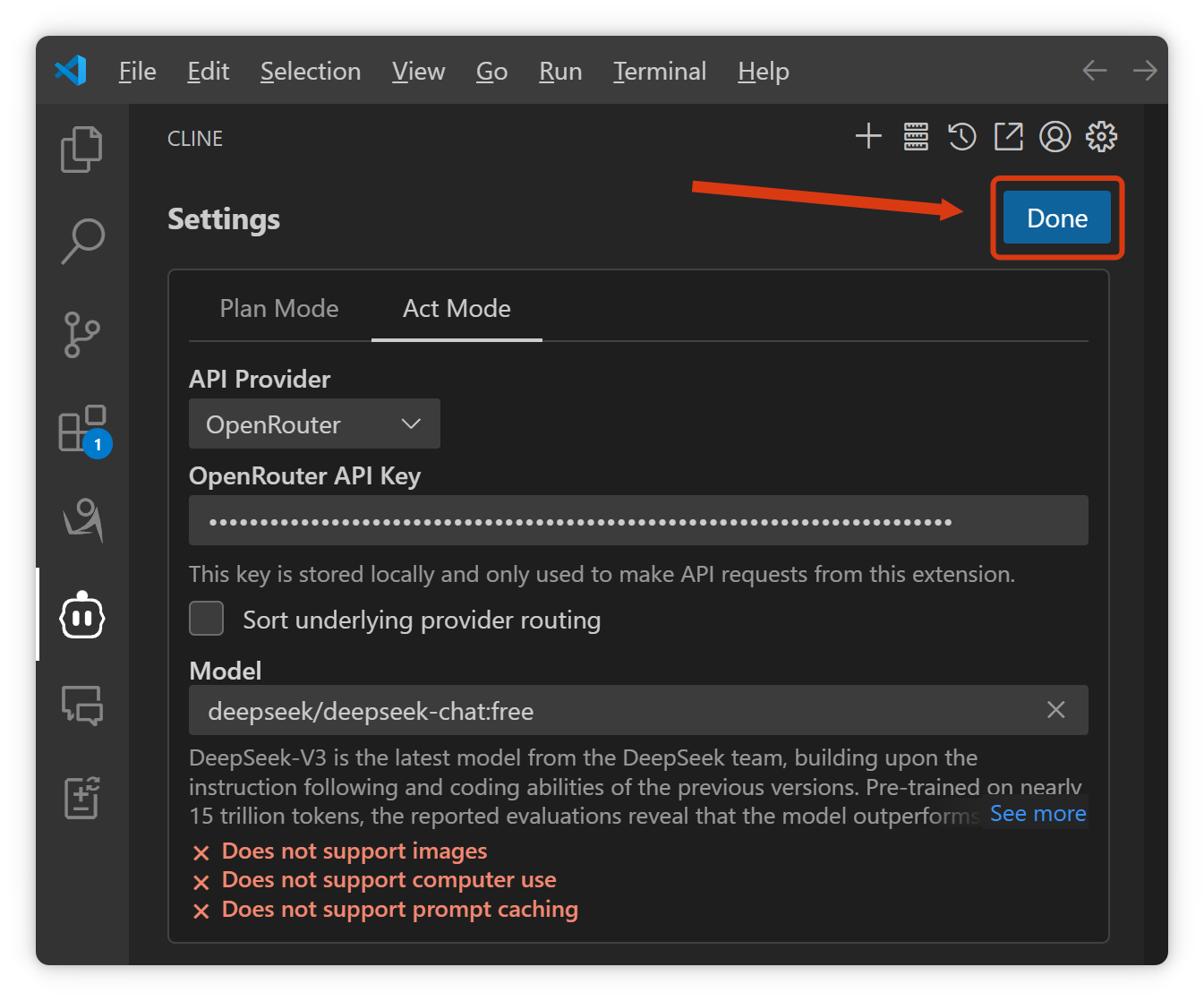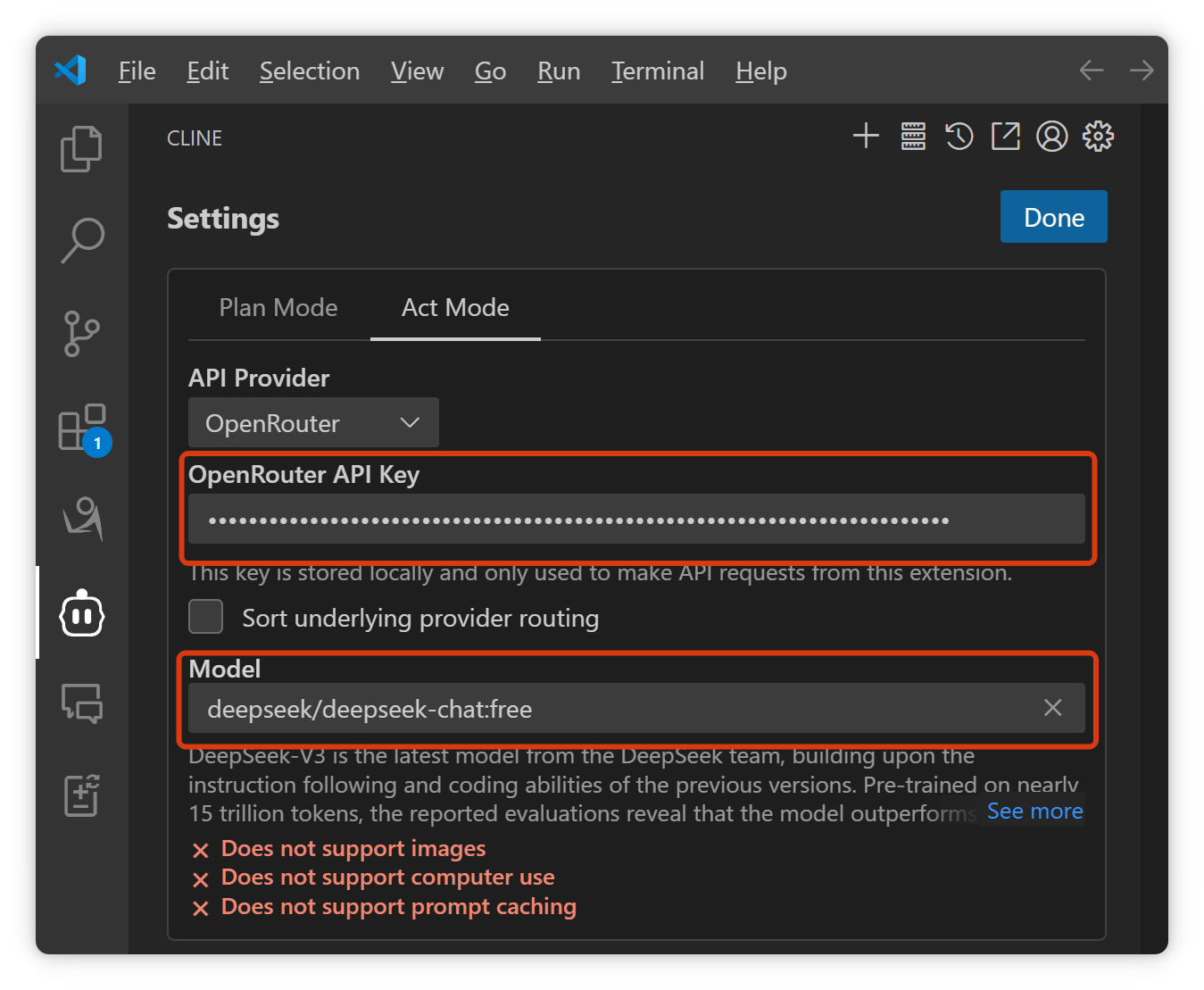 为 Plan 模式 和 Act 模式 分别配置 OpenRouter 的 API Key。例如,您可以统一使用免费的 DeepSeek 模型,但后续可以根据自己的实际需求进行调整。在写代码时,可以为 Act 模式 配置 Claude 模型,而为 Plan 模式 配置 ChatGPT 模型。这样,您可以充分利用各个模型的优势,提高 工作效率 和 智能辅助体验。
