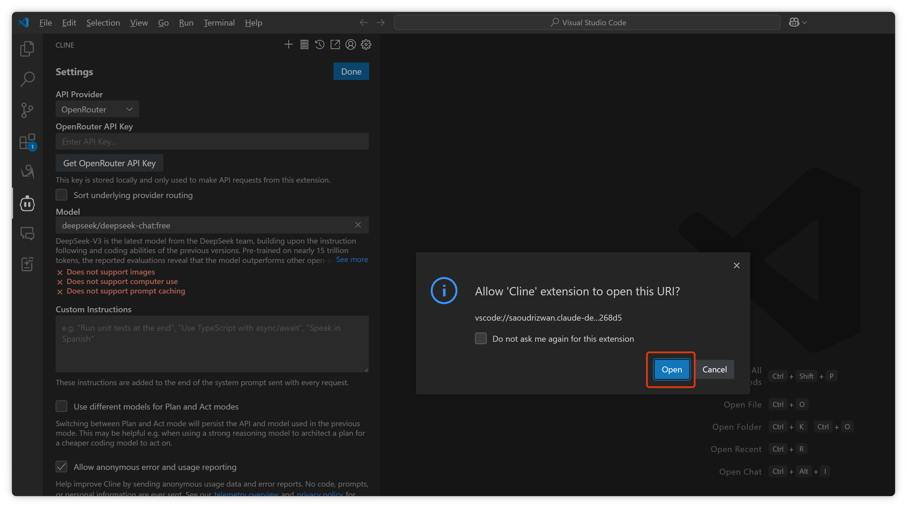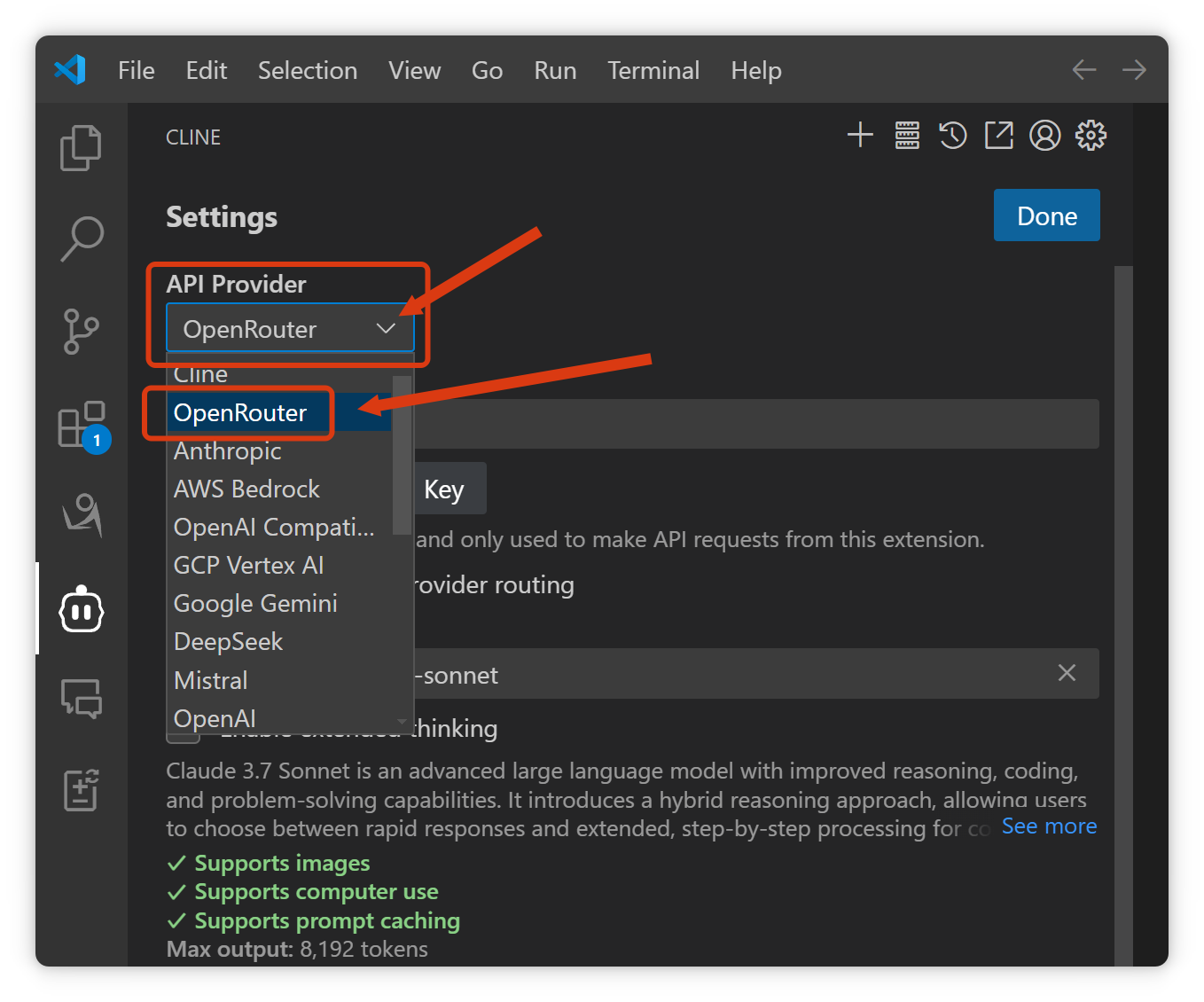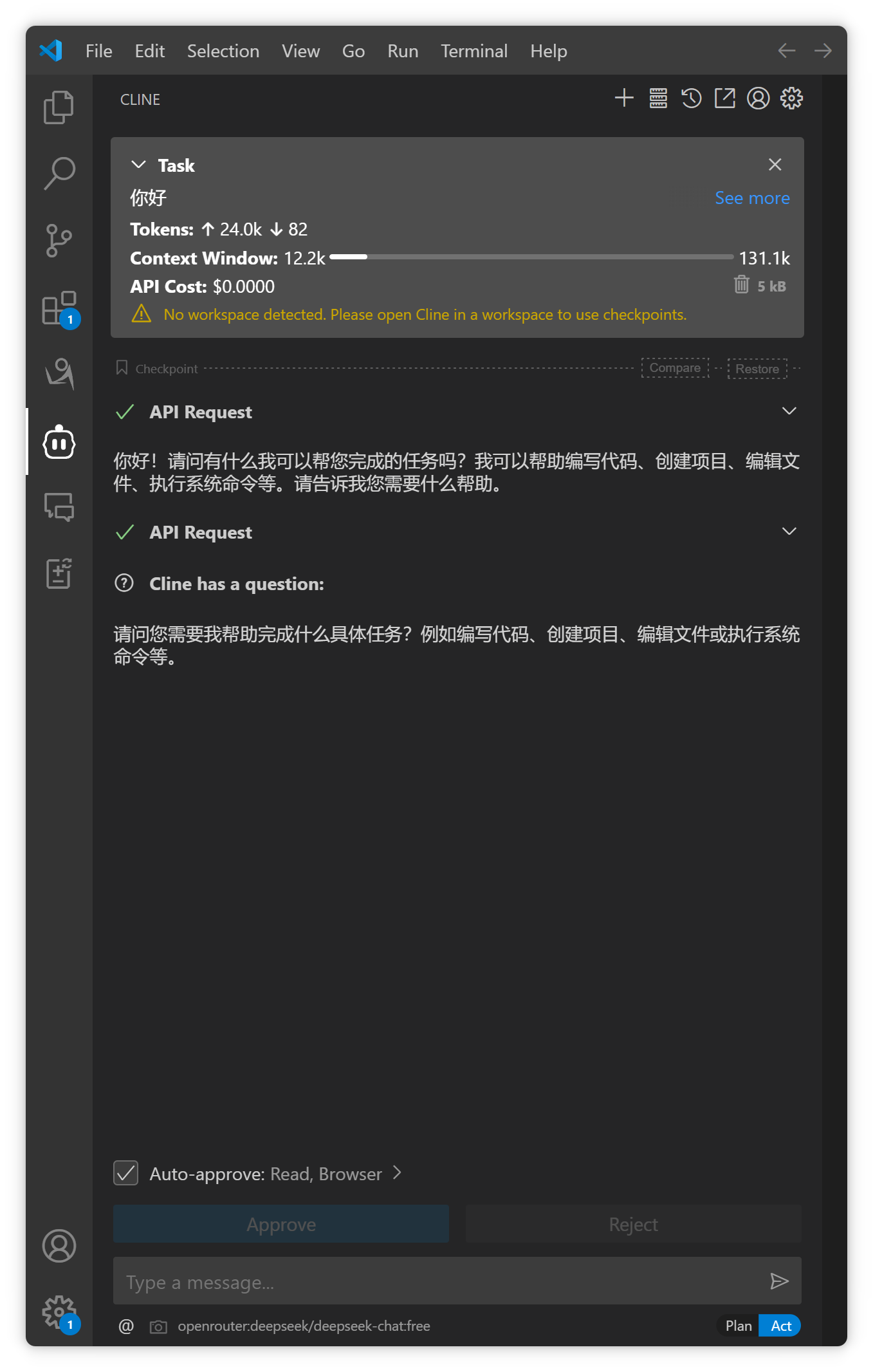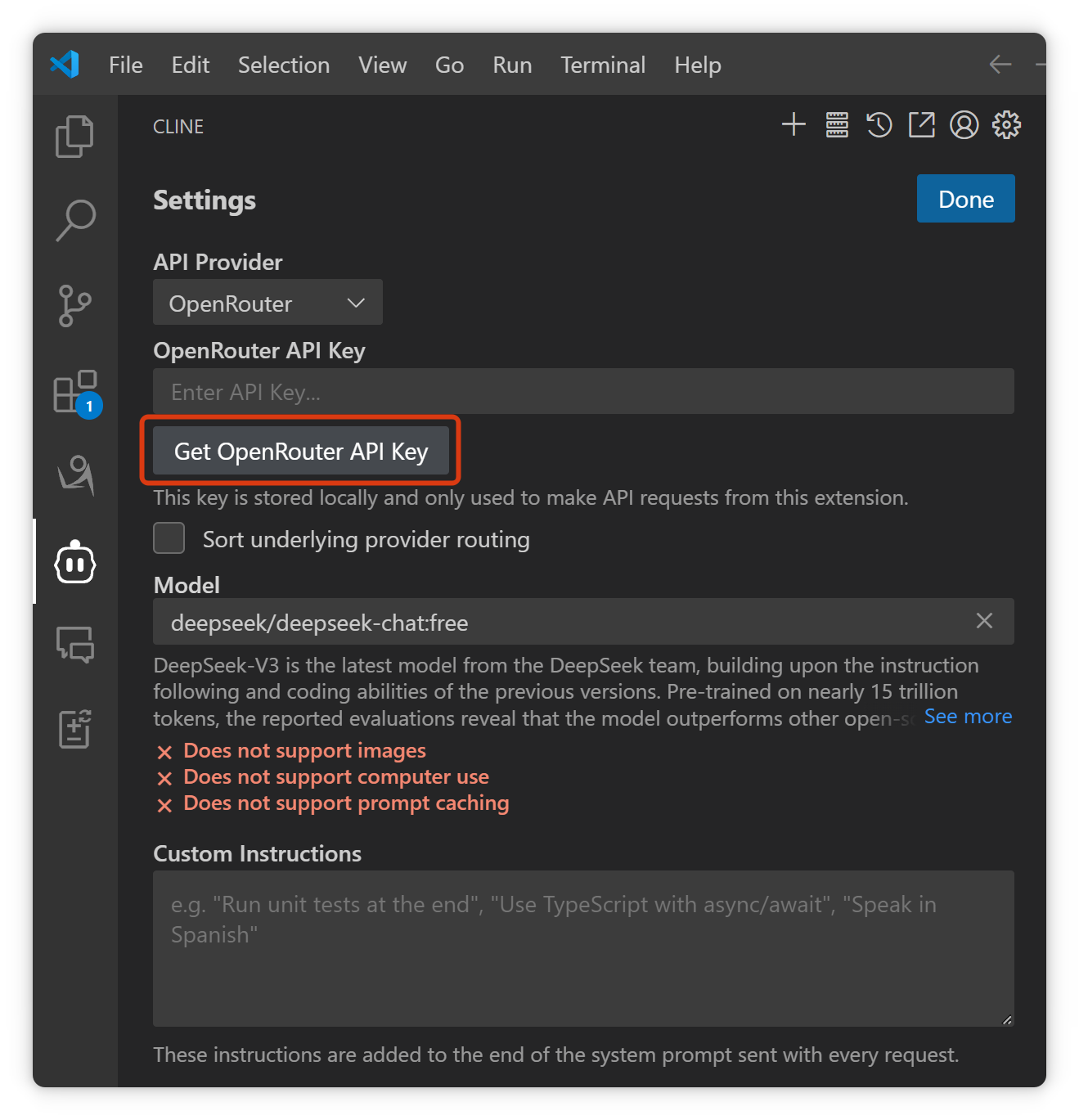 为 Plan 模式 和 Act 模式 分别配置 OpenRouter 的 API Key。例如,您可以统一使用免费的 DeepSeek 模型,但后续可以根据自己的实际需求进行调整。在写代码时,可以为 Act 模式 配置 Claude 模型,而为 Plan 模式 配置 ChatGPT 模型。这样,您可以充分利用各个模型的优势,提高 工作效率 和 智能辅助体验。