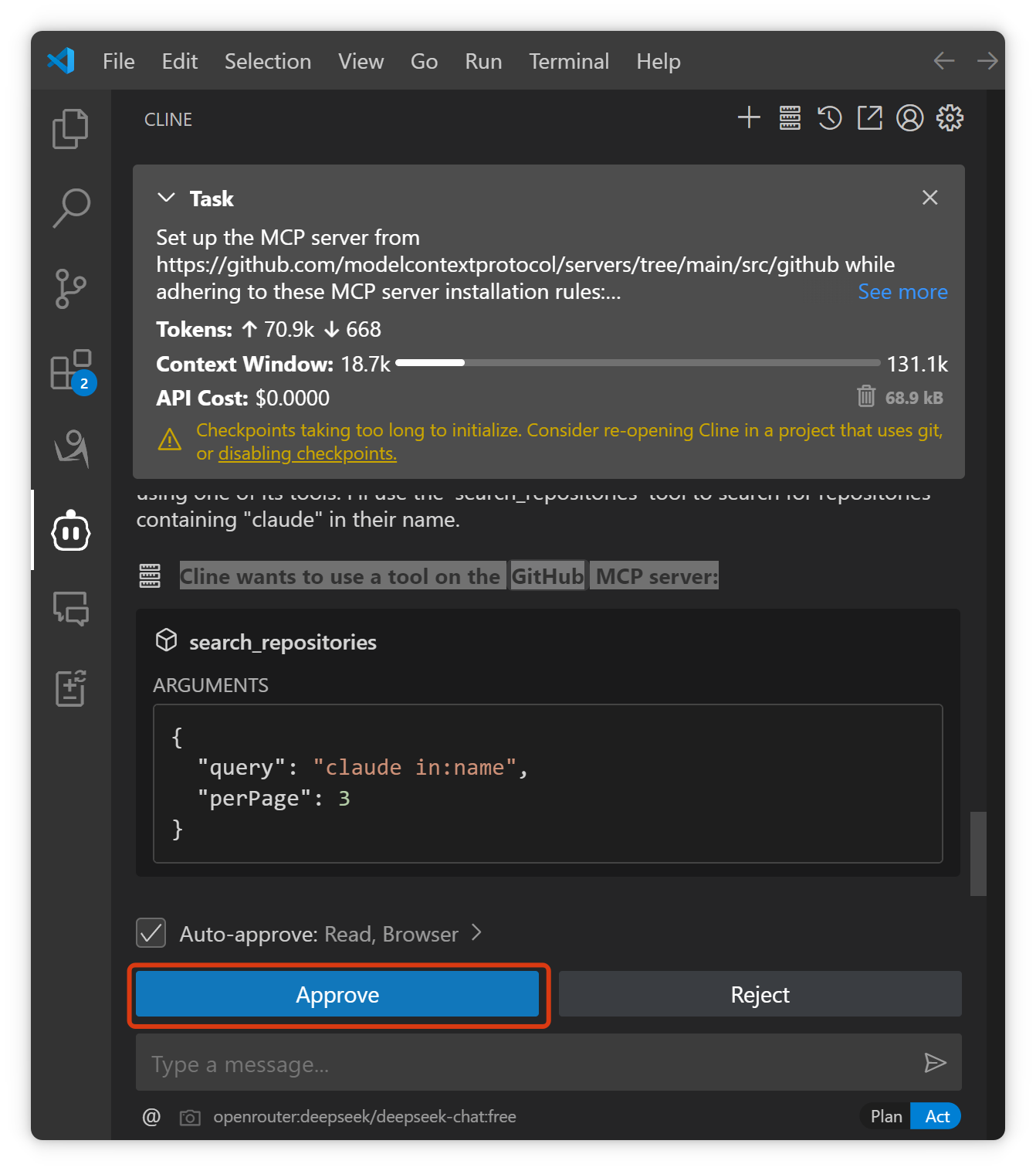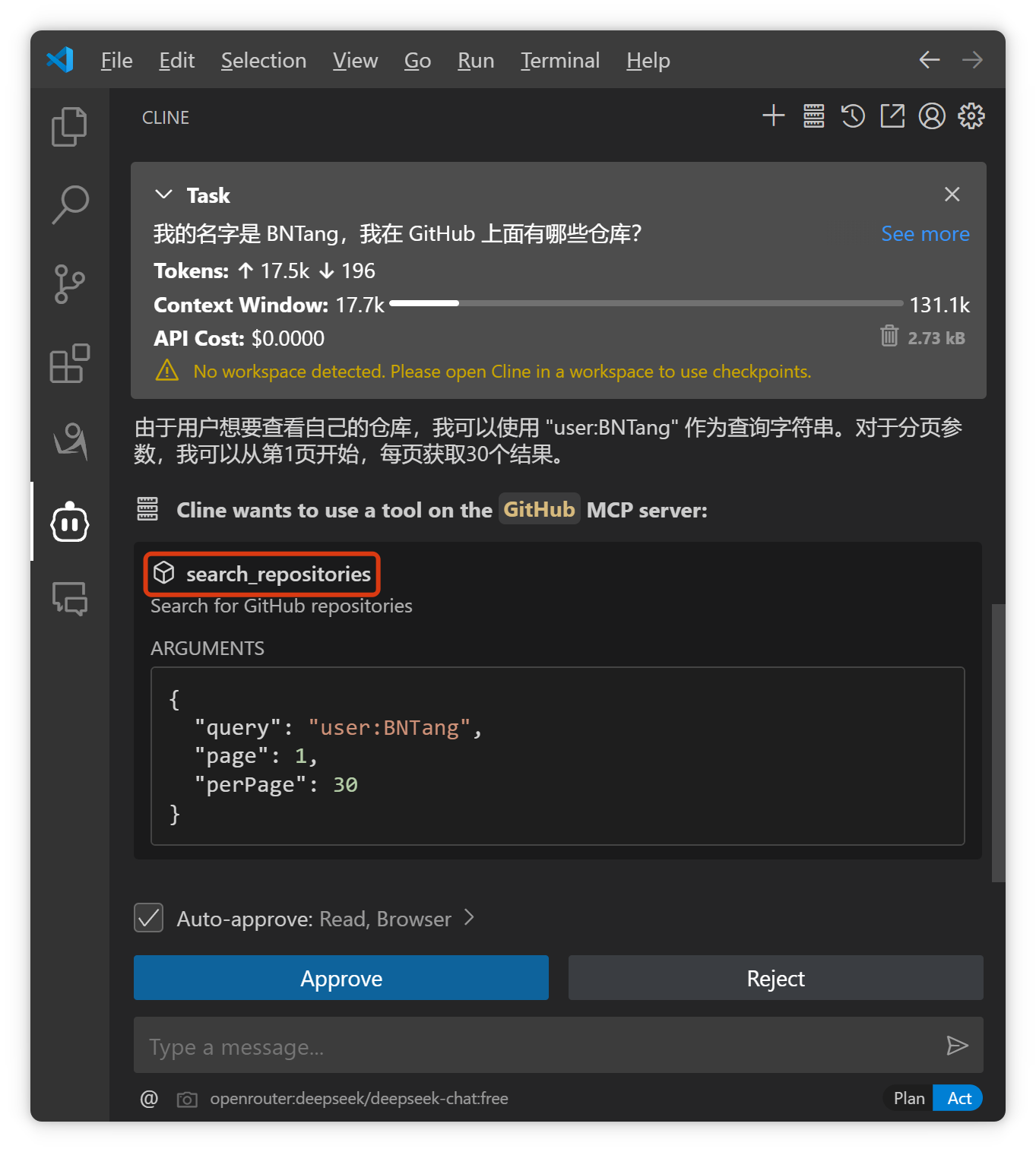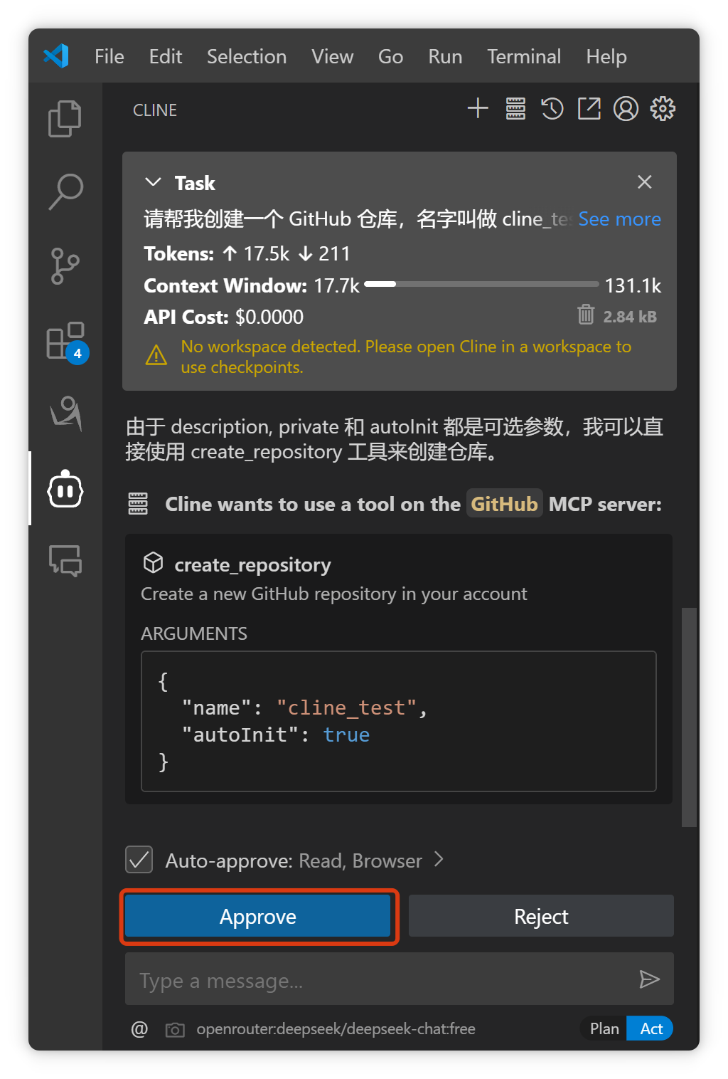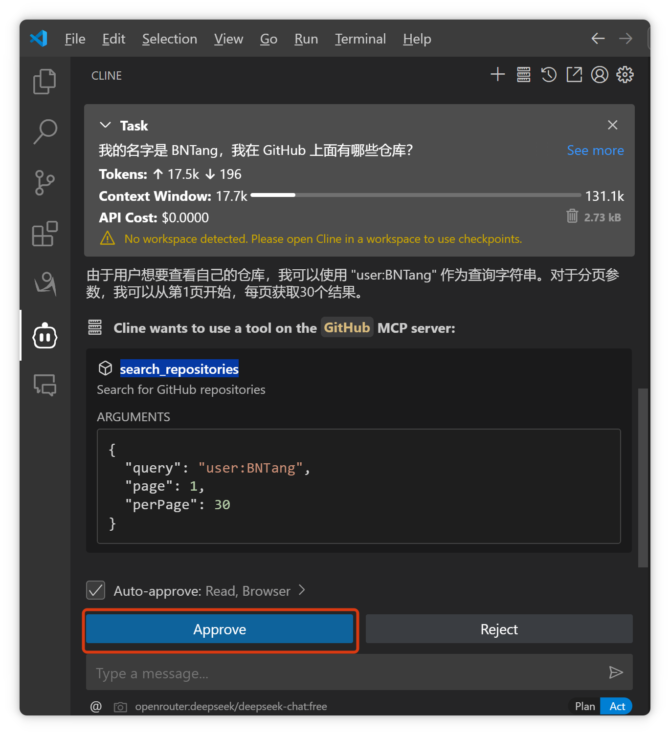Cline wants to use a tool on the GitHub MCP server,请点击 「Approve」按钮。