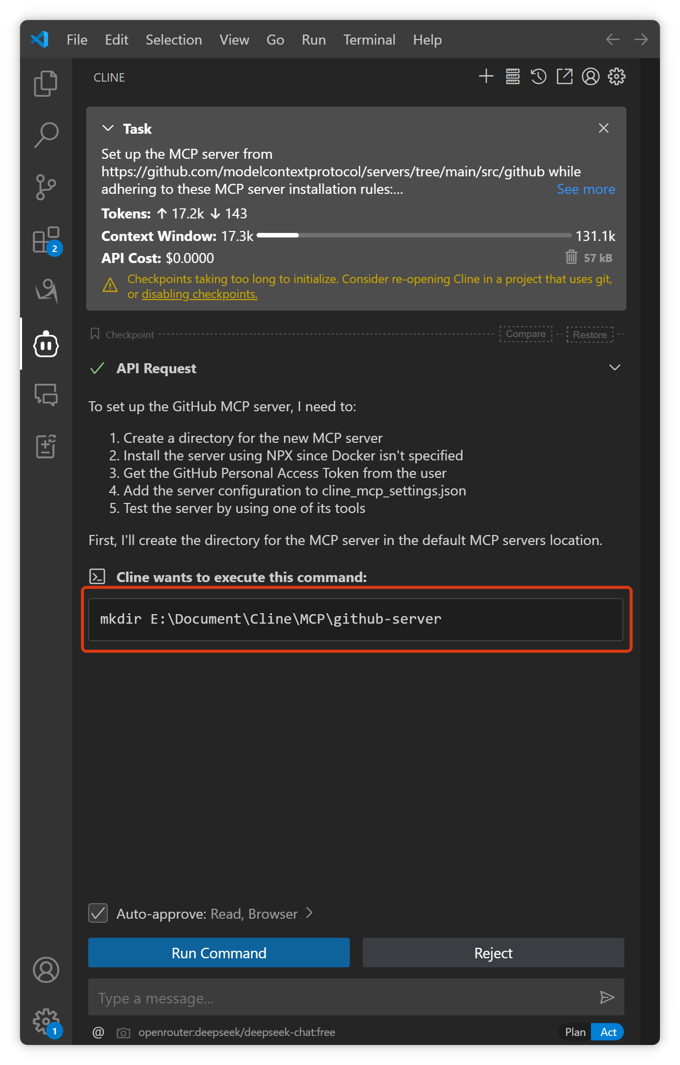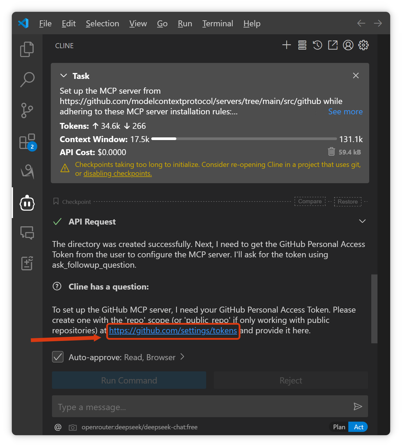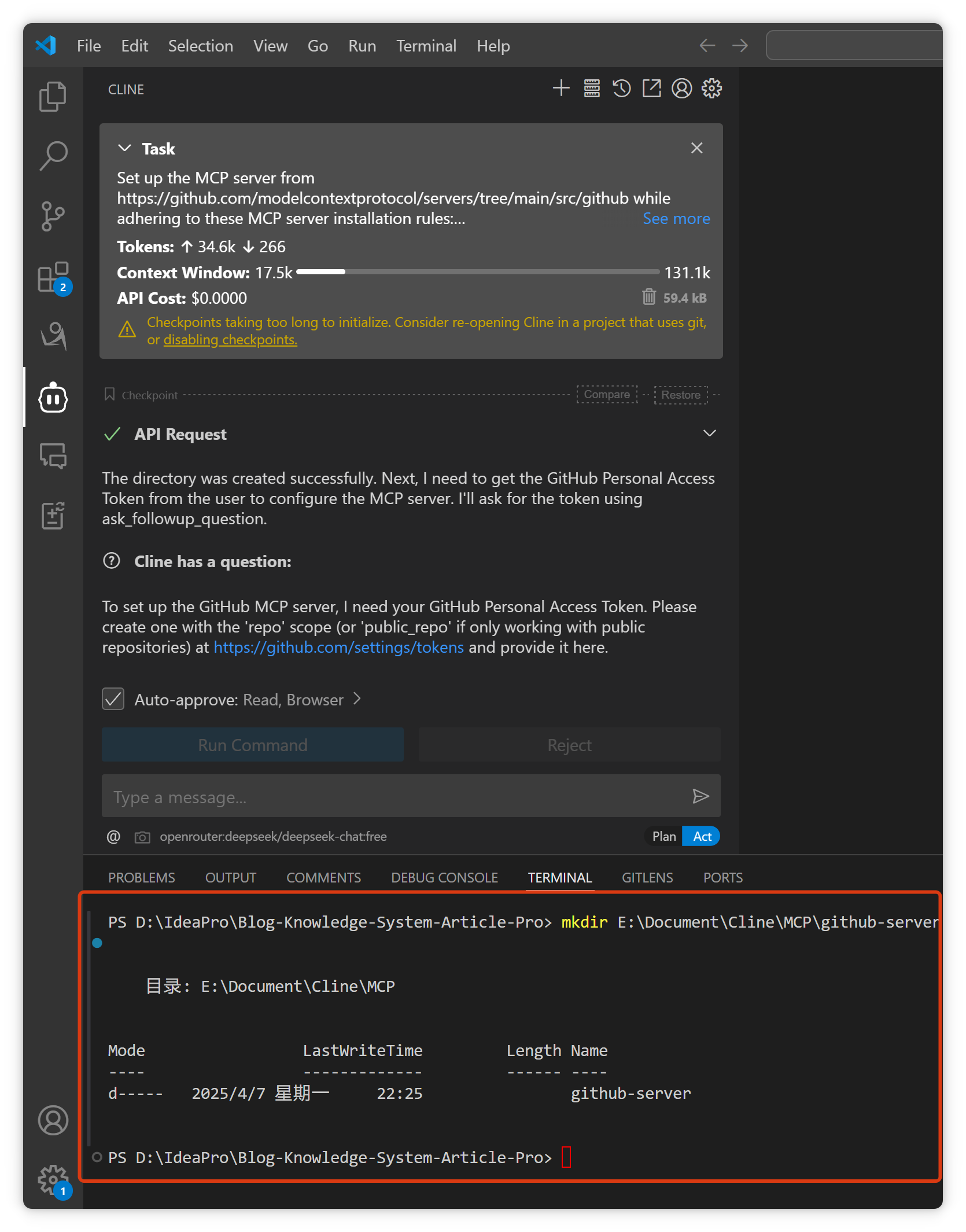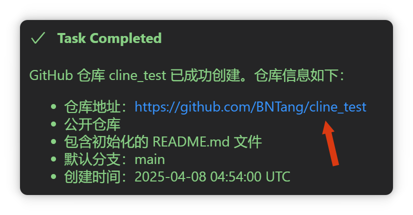 Cline wants to use a tool on the GitHub MCP server,请点击 「Approve」按钮。