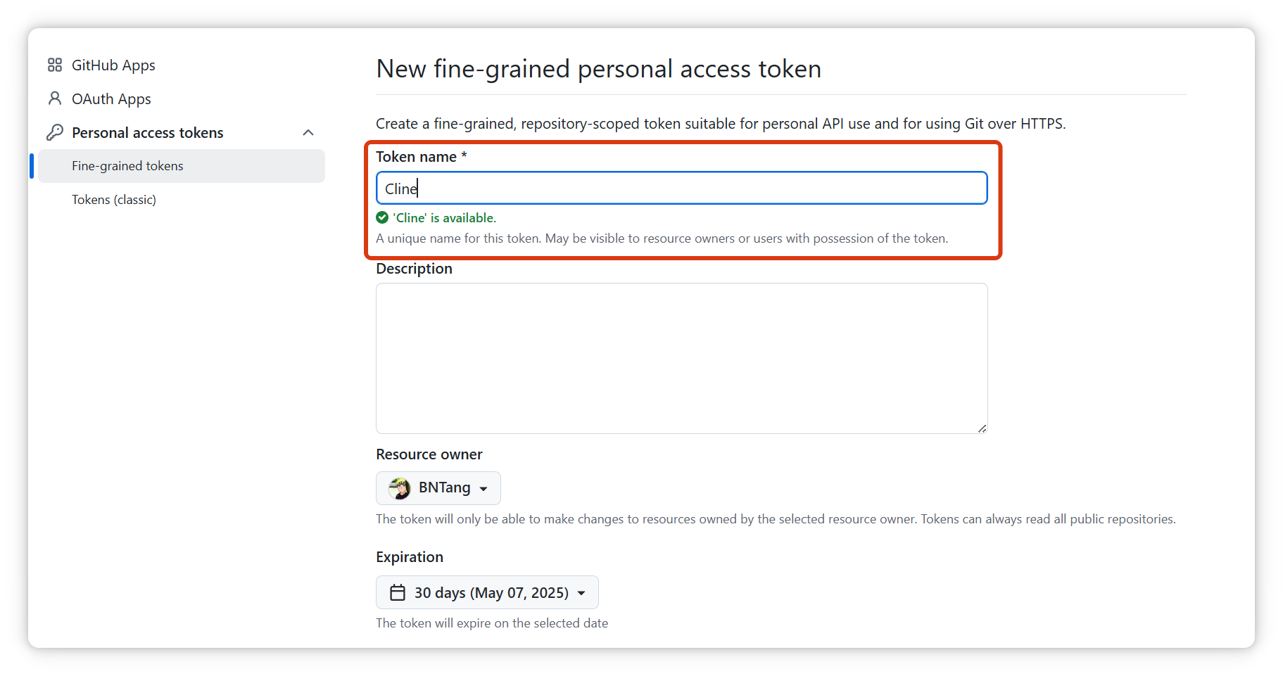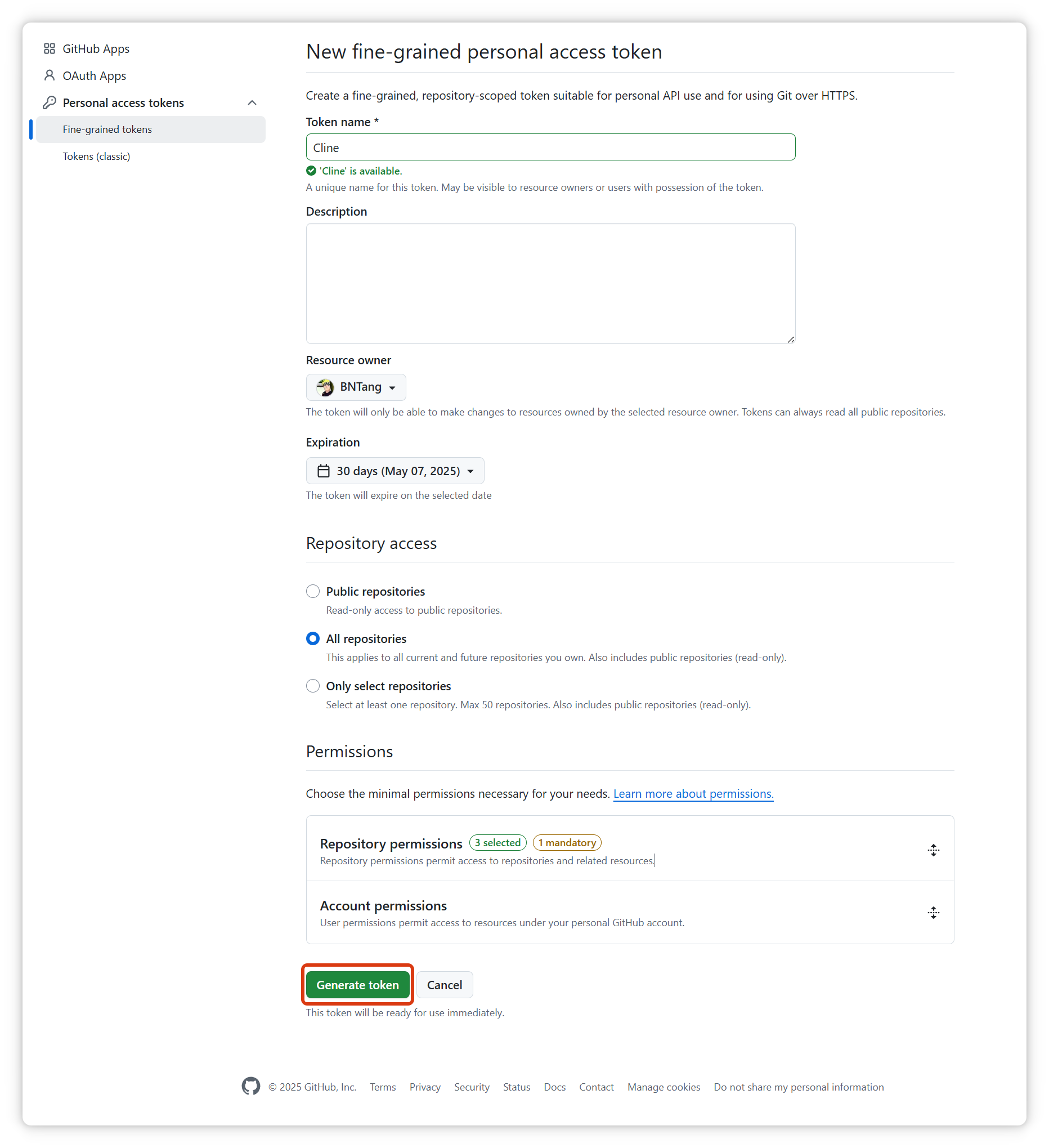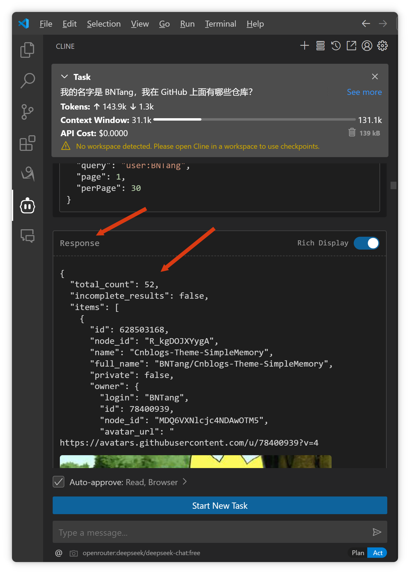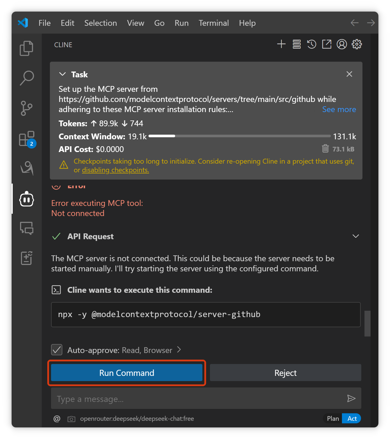 Cline wants to use a tool on the GitHub MCP server,请点击 「Approve」按钮。