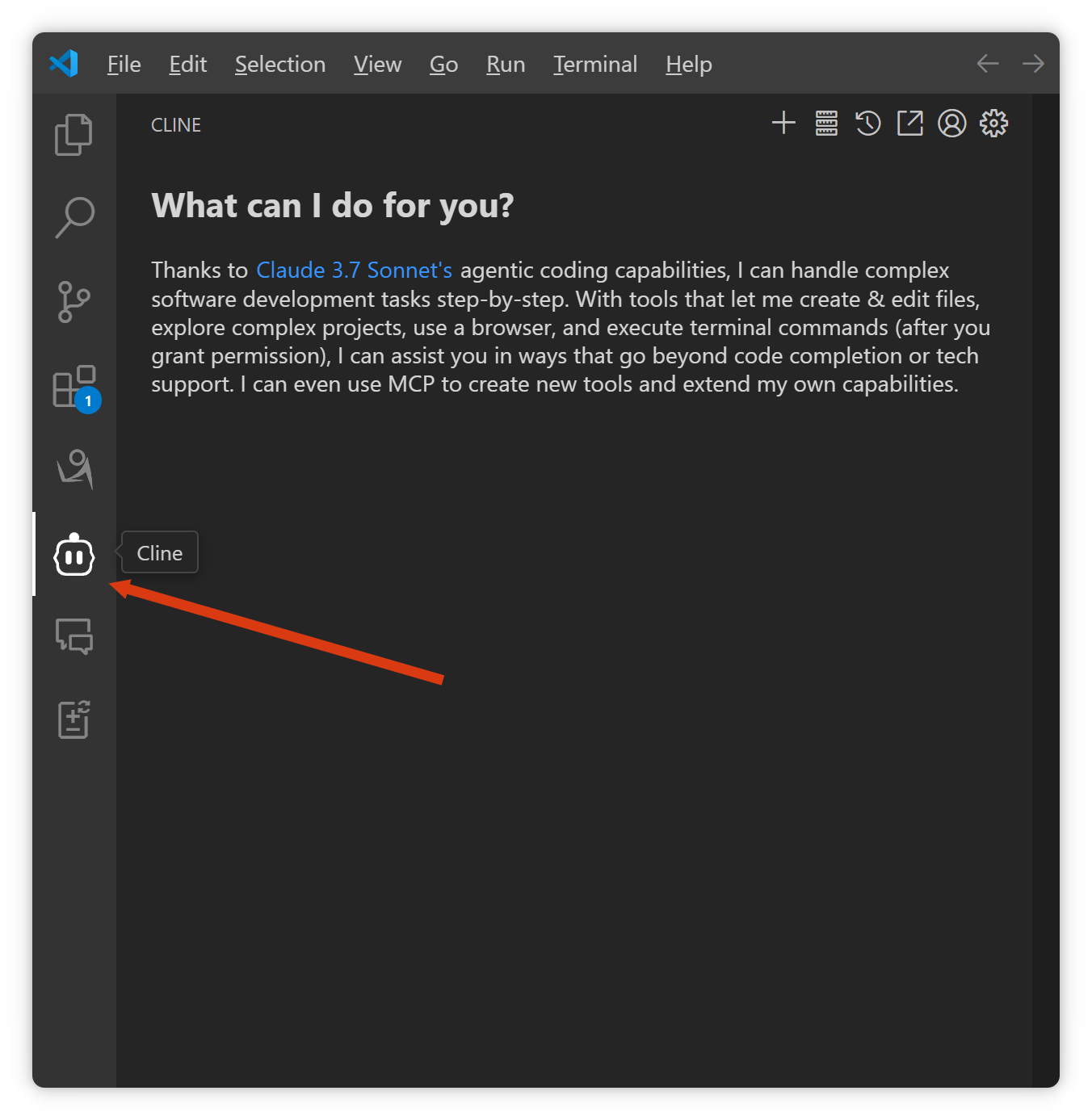 安装完成后,在左侧面板找到 Cline,点击进入: