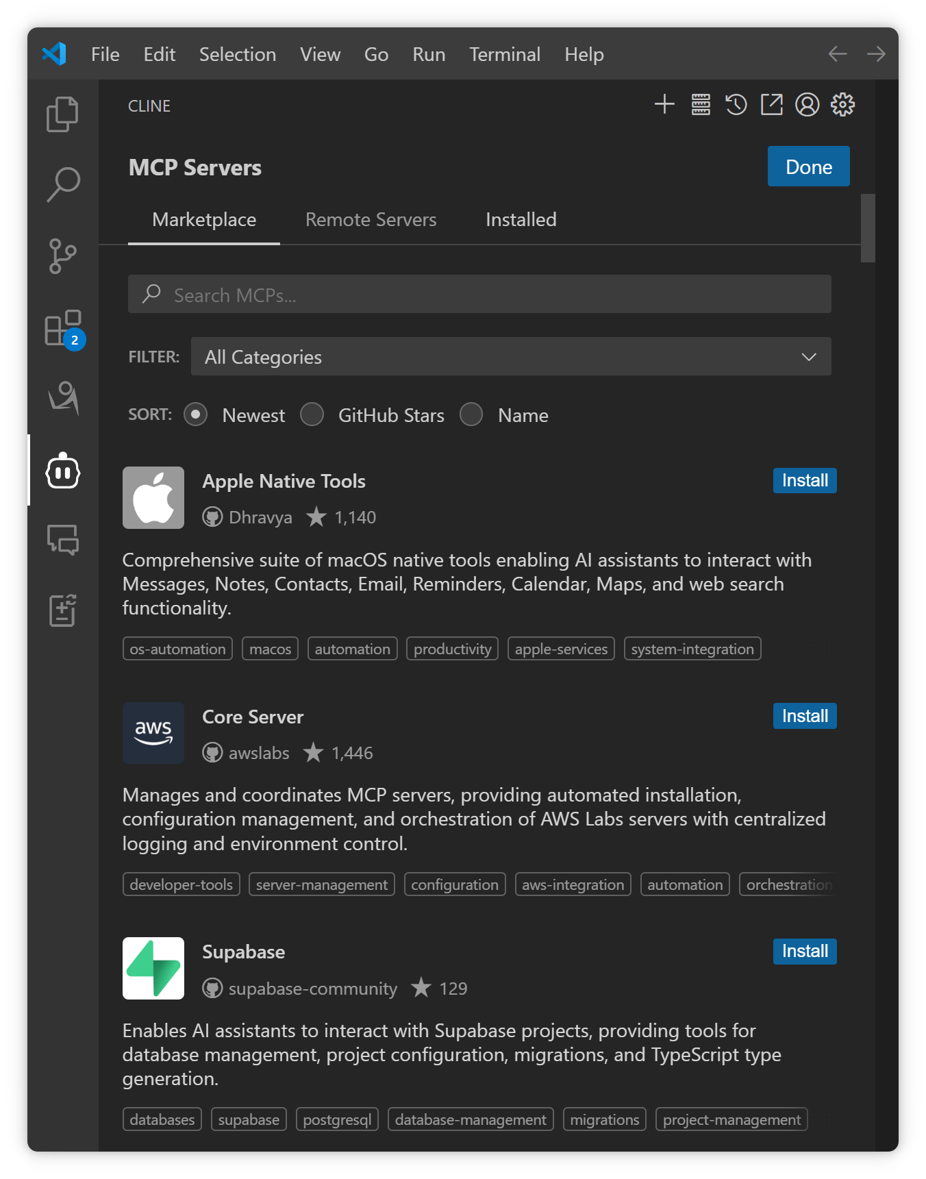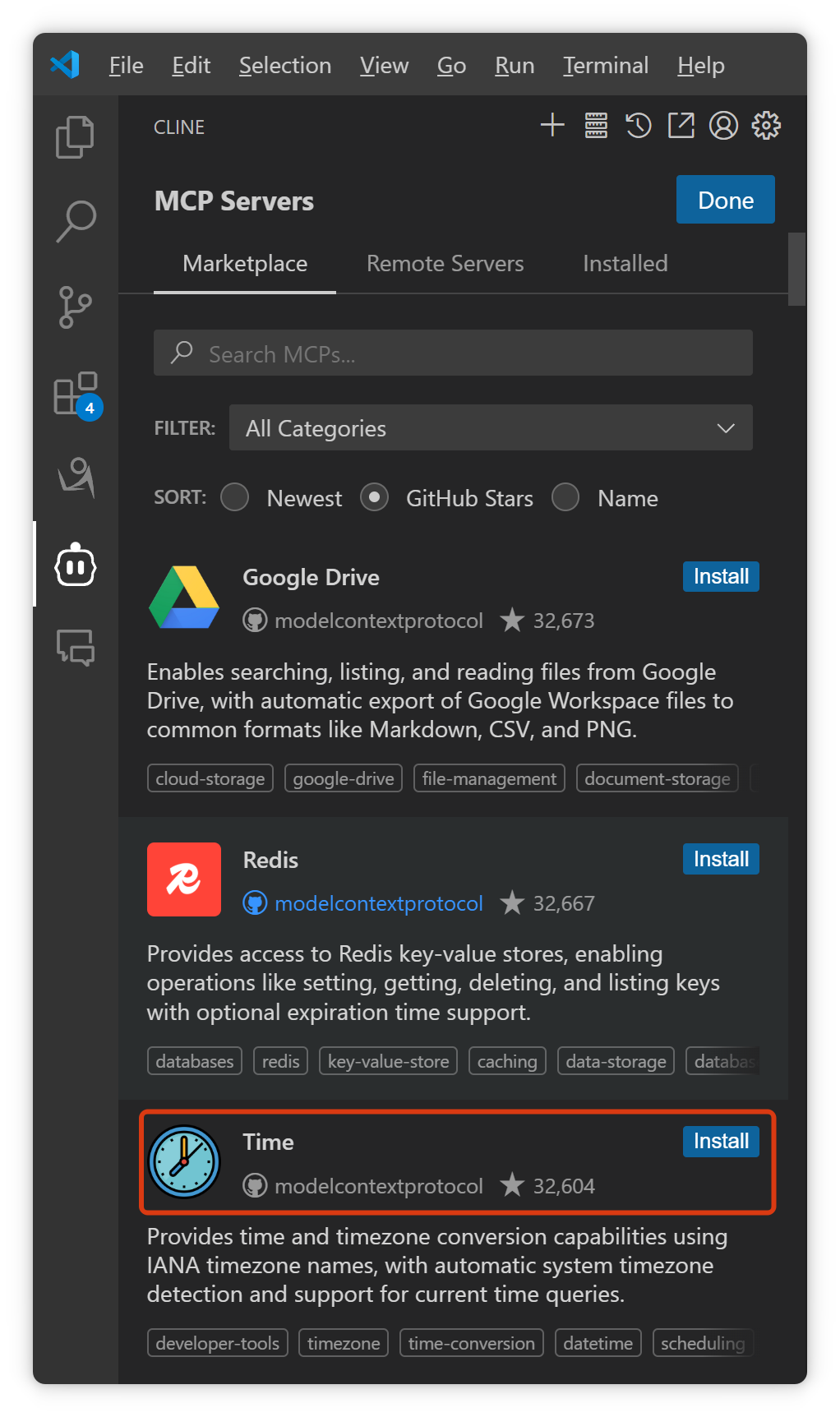当我打开 Cline 的 MCP Servers 时,便发现了许多新工具等待探索。