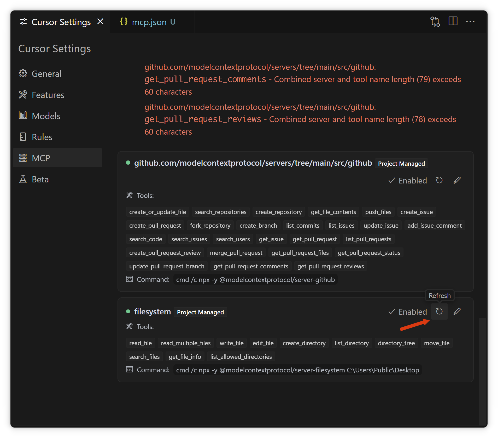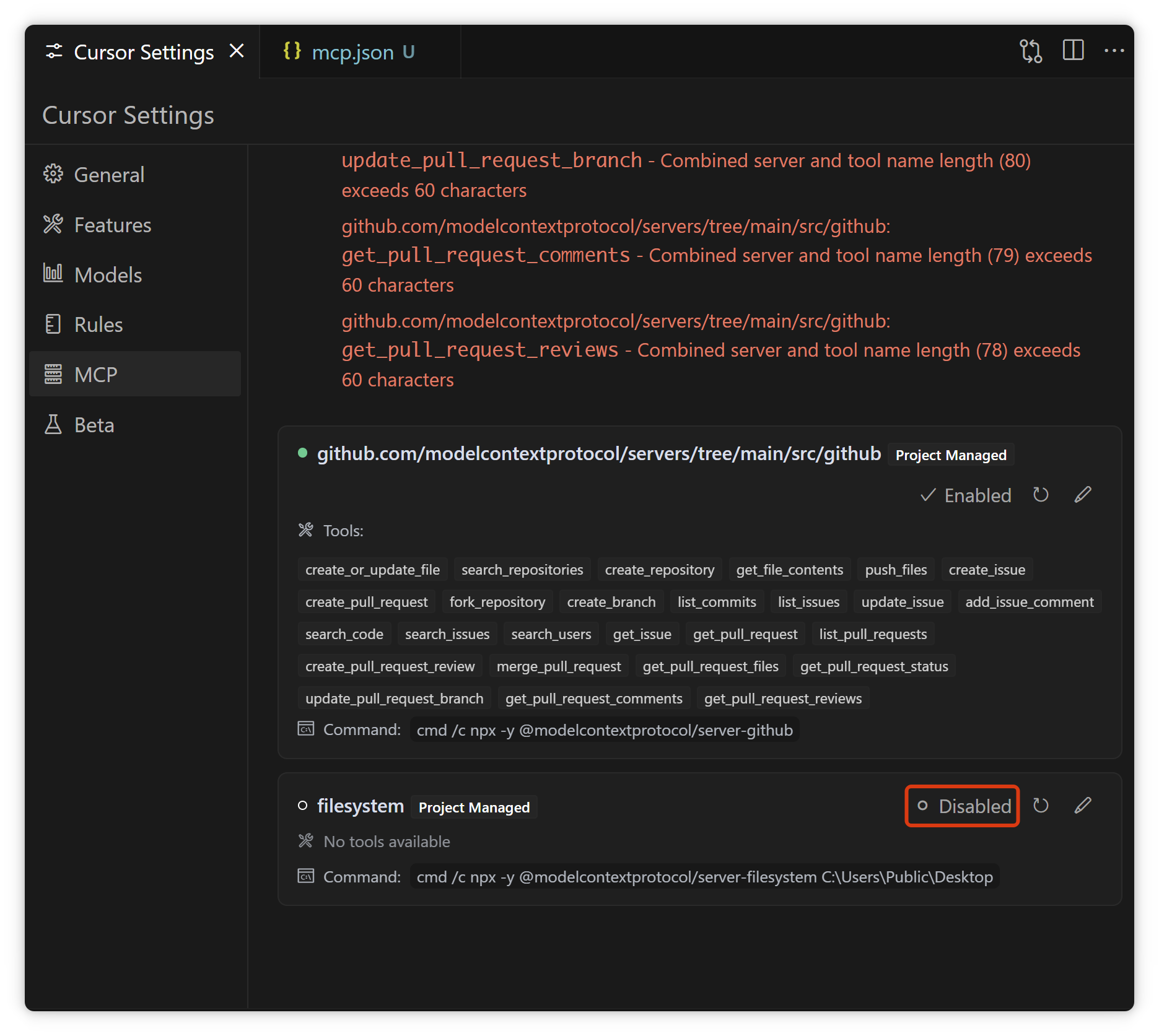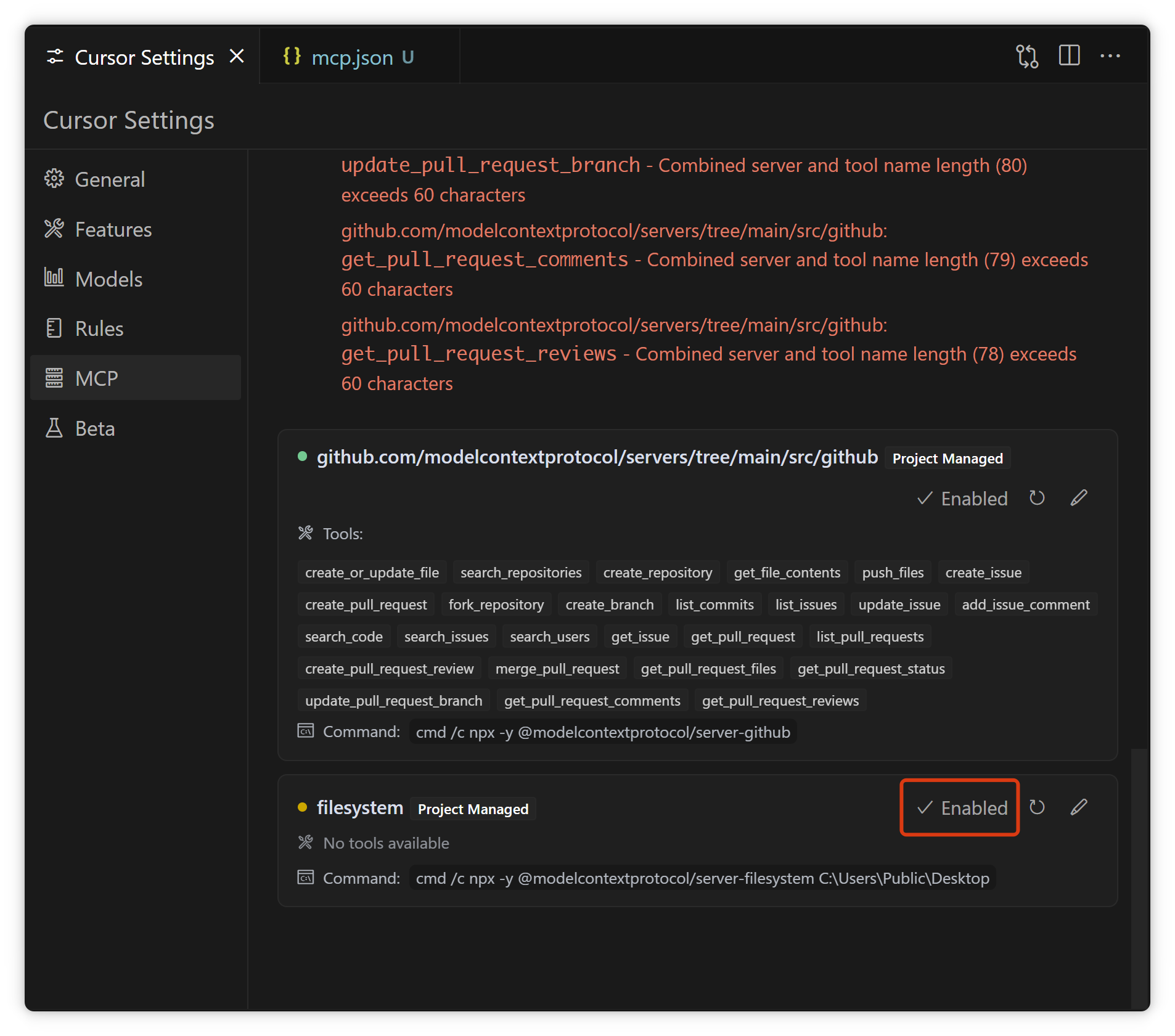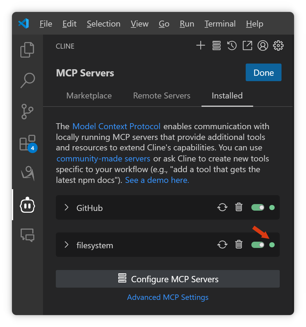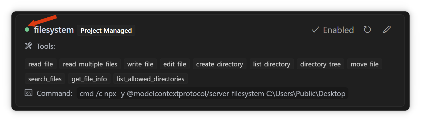 保存后,可以看到 file system 这个 MCP Server 也已经变为绿色状态: