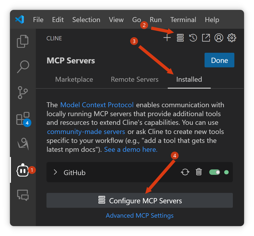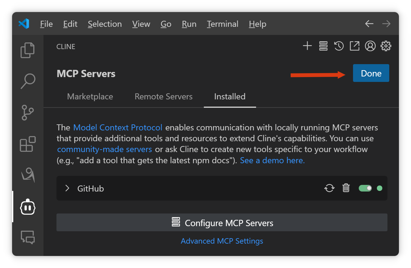 我们回到 Cline,点击这个 MCP Server 的小图标。
