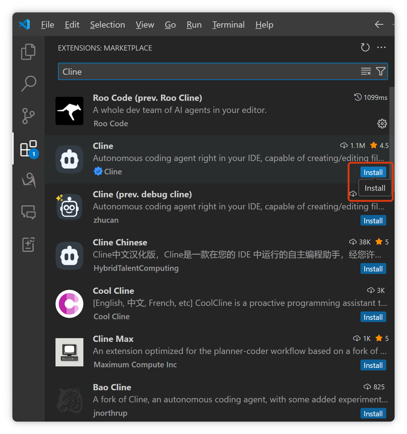 在 Extensions 市场中搜索 Cline,找到并点击 安装插件: