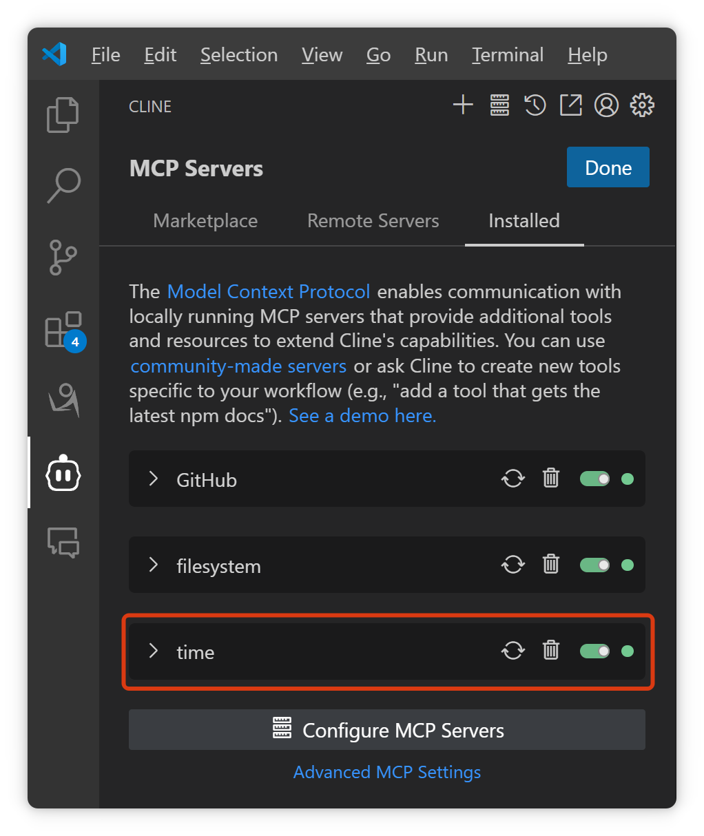 第六步:验证 MCP Server 是否成功加载,回到 Cline 的 MCP Server 面板,切换到 Installed 选项卡,确认 time 已变为绿色状态: