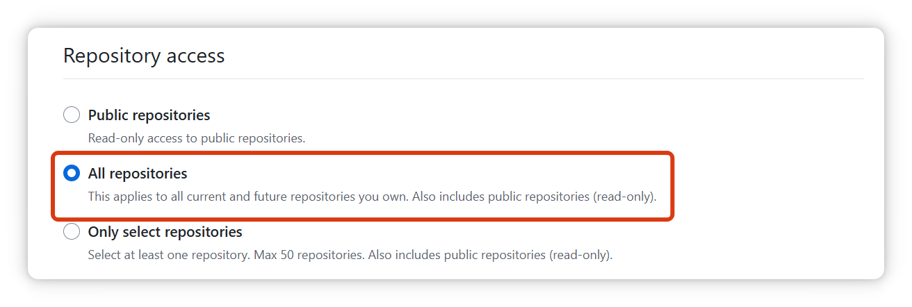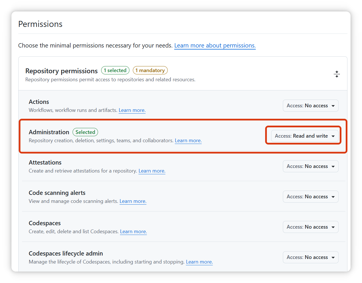 这里我为他提供了创建仓库的权限,请将 Administration 权限设置为 Read and write。