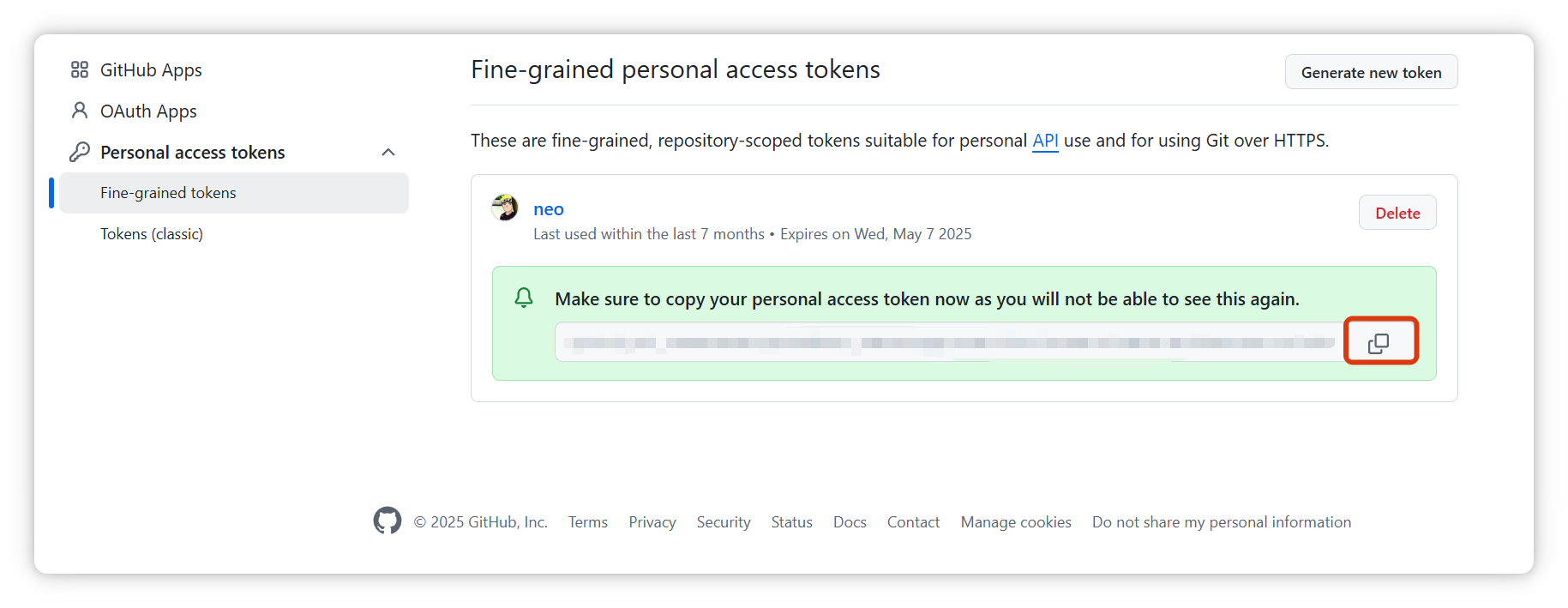 这样,我们的 GitHub Token 就创建完成了。请记得为令牌设置一个合适的 过期时间,否则 GitHub 会显示黄色警告 :warning:(这里我操作得太快,没有截取对应的图片,也就不再回退了)。接下来,我们 复制生成的 Token 即可。