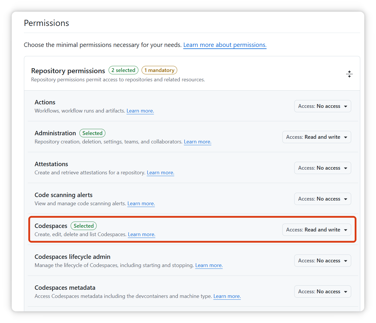 此外,还有 编写代码的权限,请将 Codespaces 权限 设置为 Read and write。