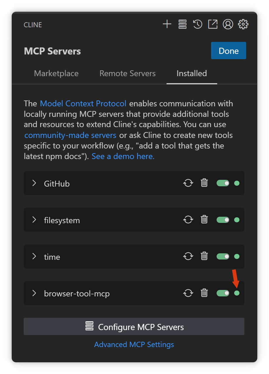此时,我们查看 Cline 的 MCP Server 选项卡,发现 browser-tool-mcp 已经变成绿色,说明安装成功: