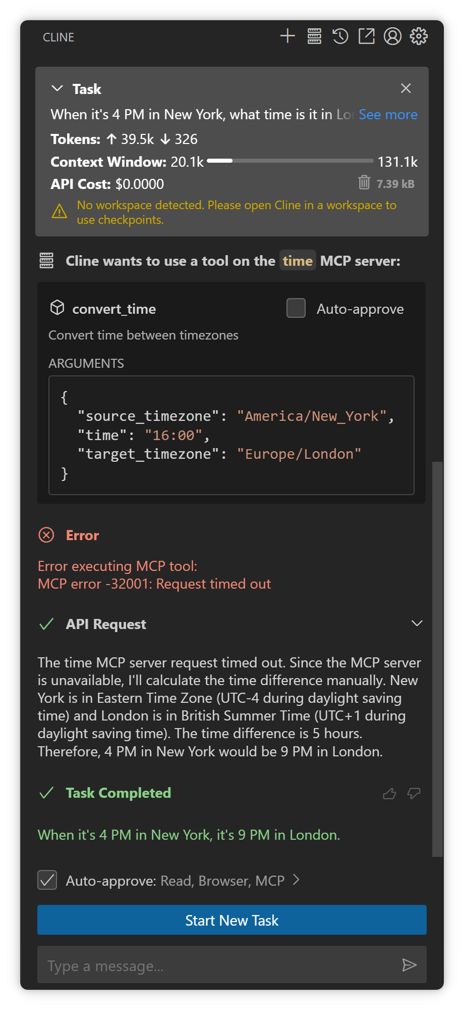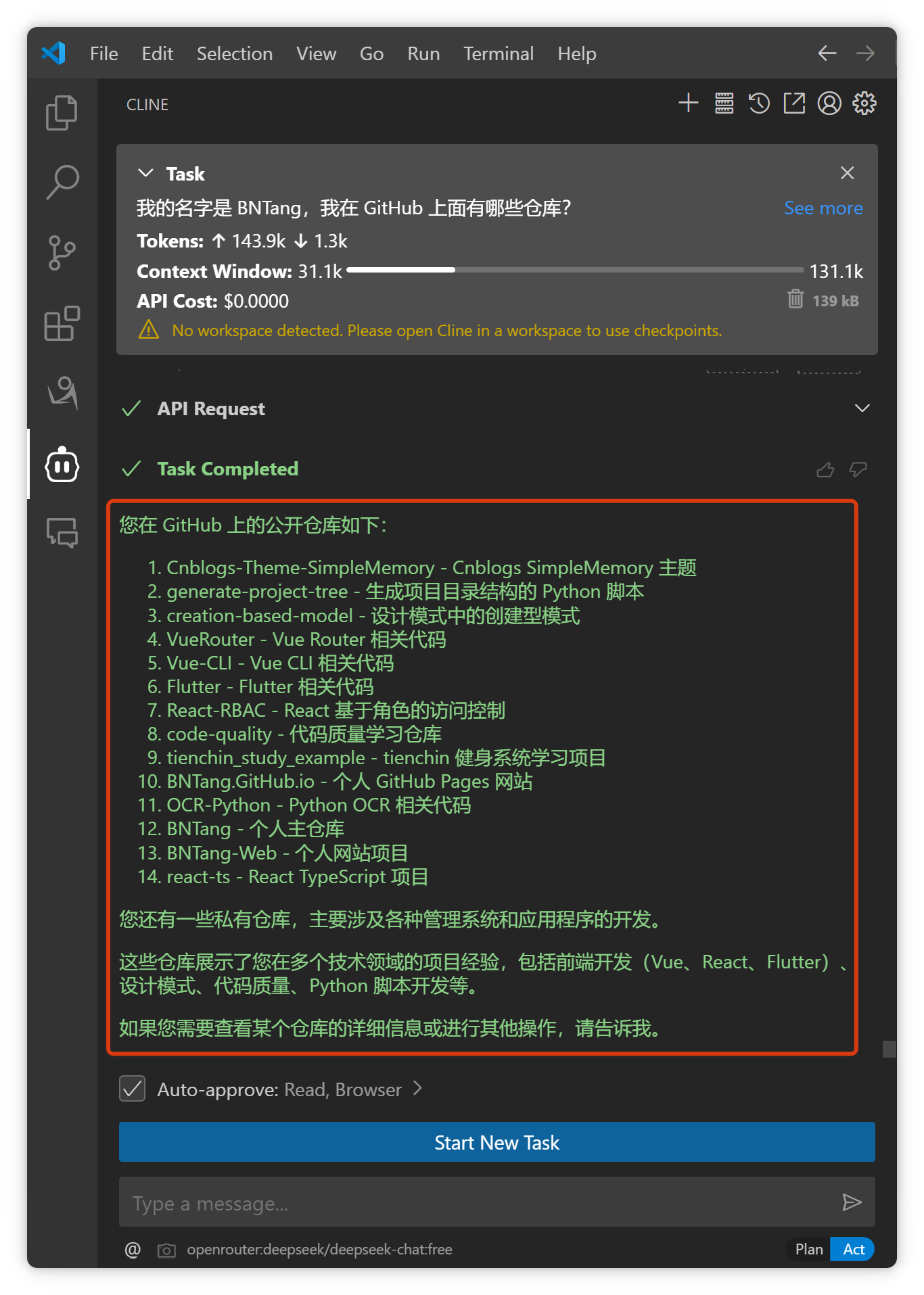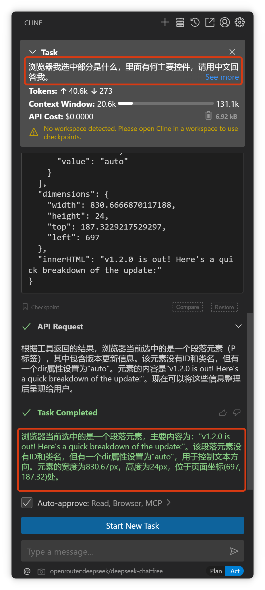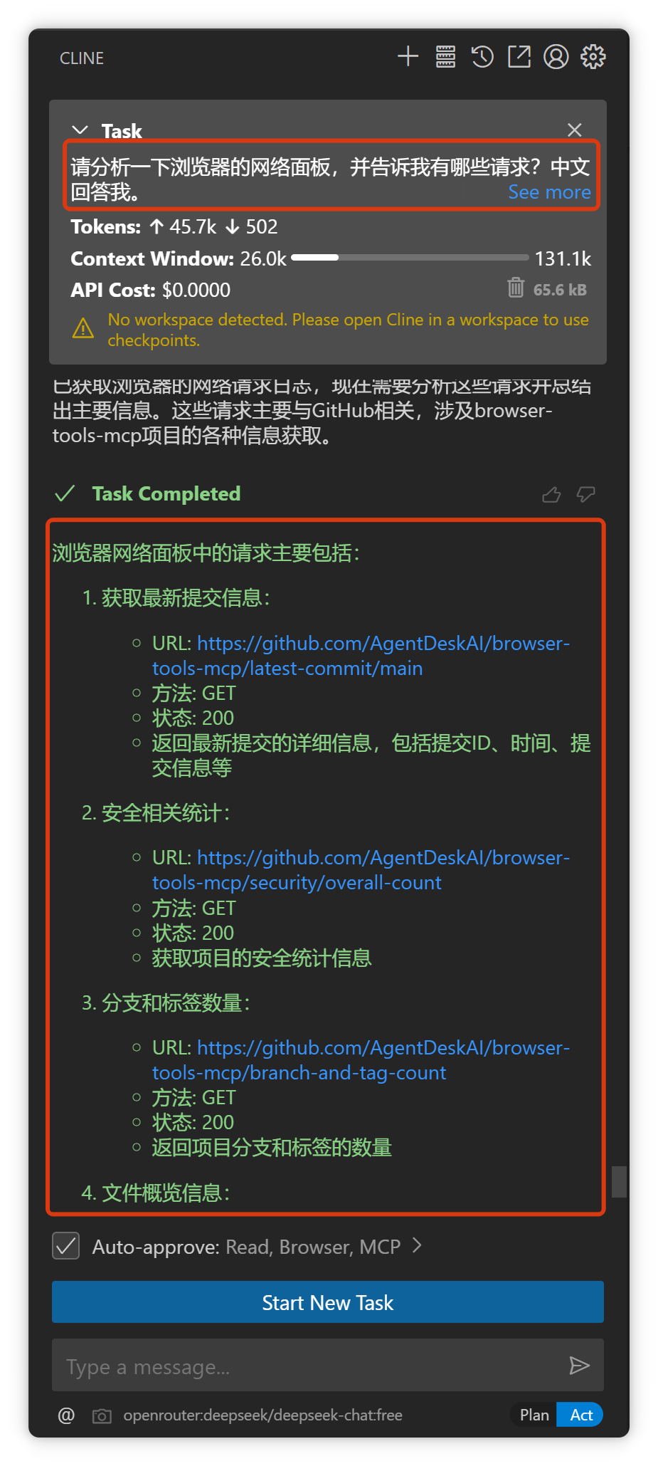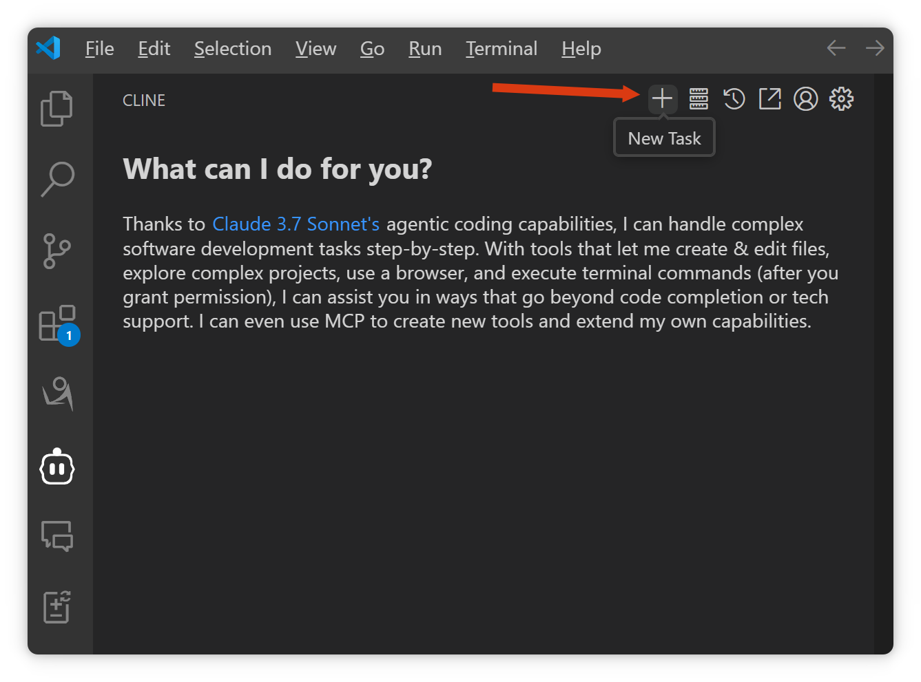 接下来,返回 Cline 的主界面,点击 New Task 开始测试。