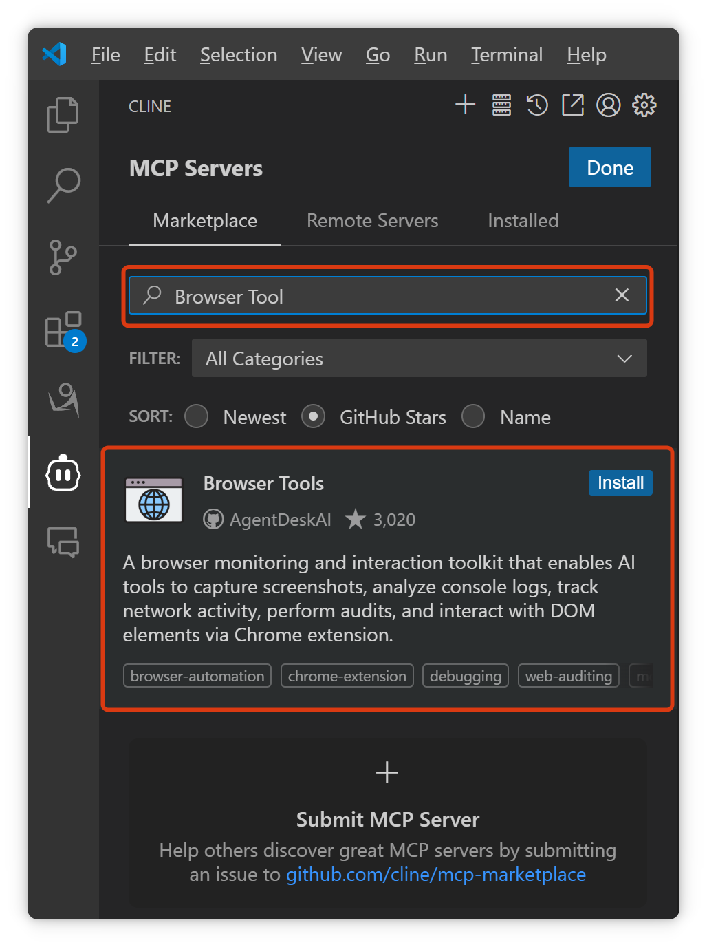 我们来看一个前端开发必备的 MCP 工具,名为 Browser Tool。首先,在 Cline 中搜索 Browser Tool,点击进入其 GitHub 页面: