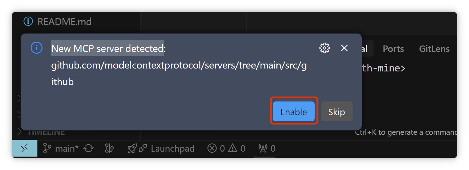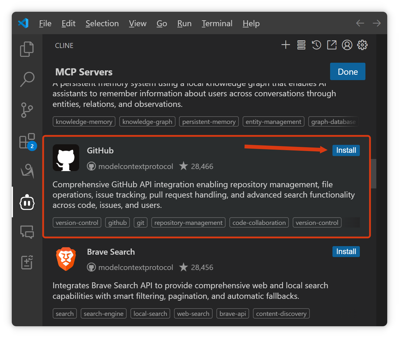 在这里找到非常受欢迎的 MCP 服务器。我们的第一个 MCP 服务 以这个 GitHub 项目 为例。请点击 “安装”(Install) 按钮进行安装。