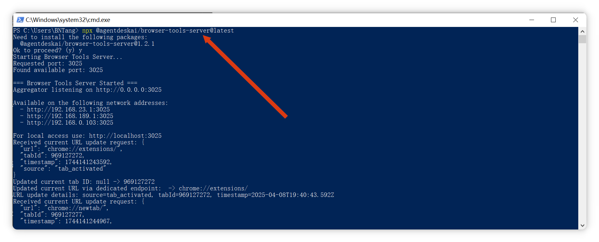 npx @agentdeskai/browser-tools-server@latest在命令行中执行以 server 结尾的命令(我是在 Powershell 中执行的):