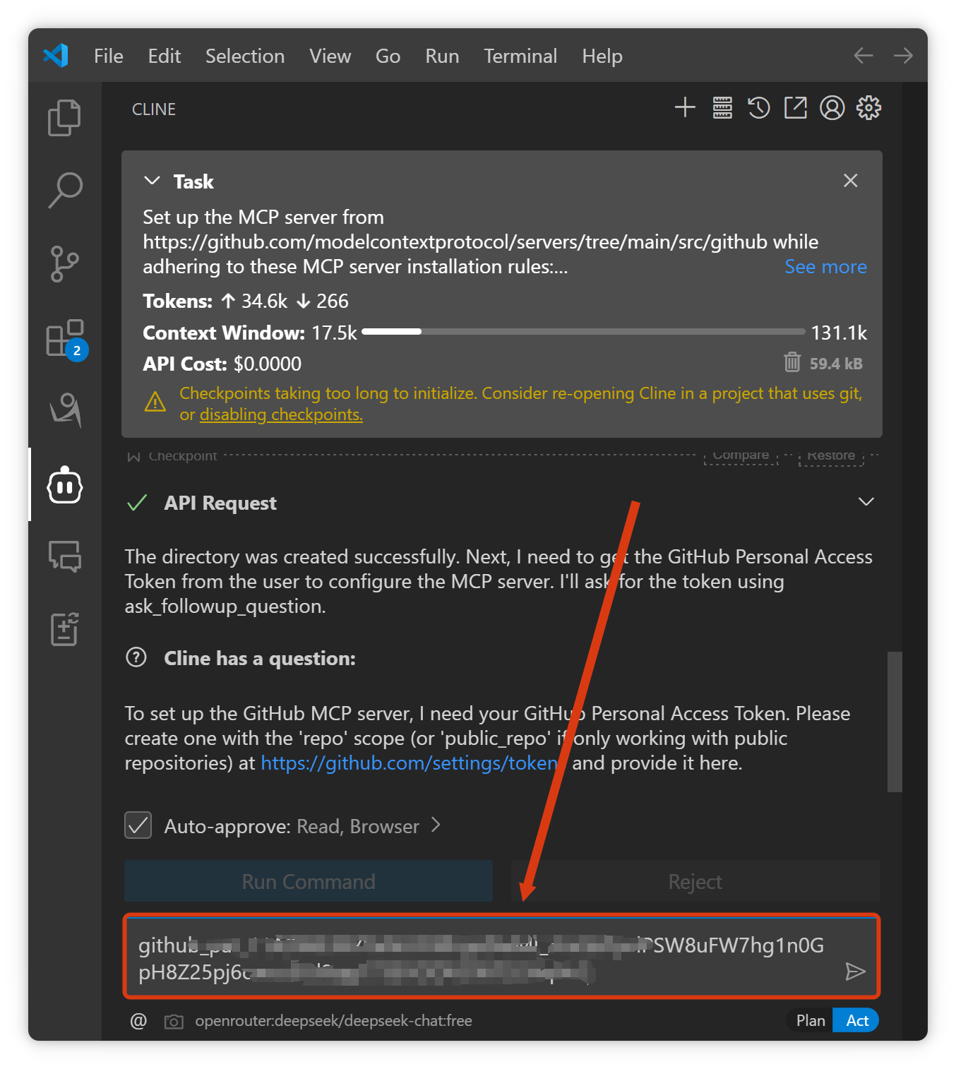 回到 Cline,粘贴 Token 后,点击 「发送(Send)」按钮 即可。