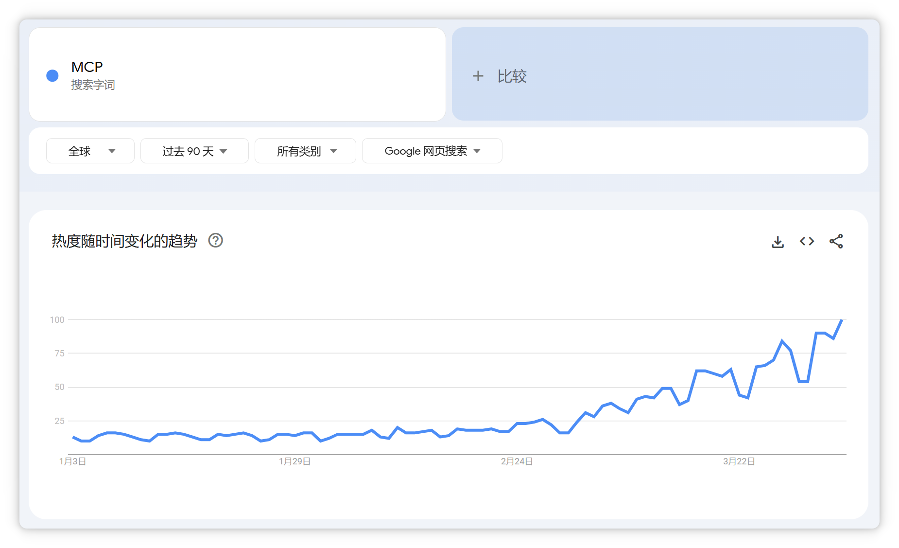 我搜索了 “MCP”,它的趋势如图所示,变化非常明显。