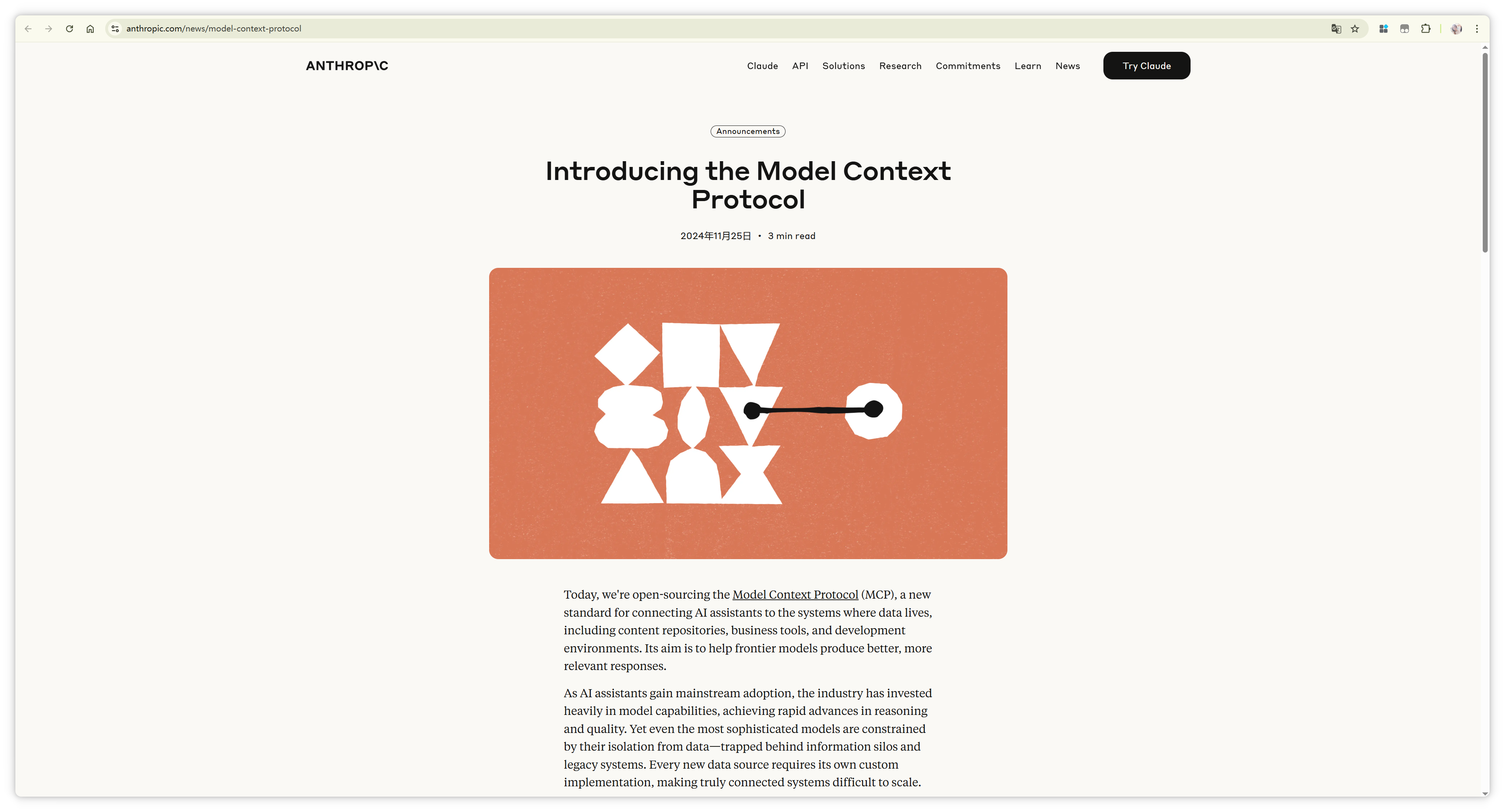 MCP(Model Context Protocol,即模型上下文协议)是由 Anthropic(Claude 的母公司)于 2024年11月 开源发布的一项 全新技术。