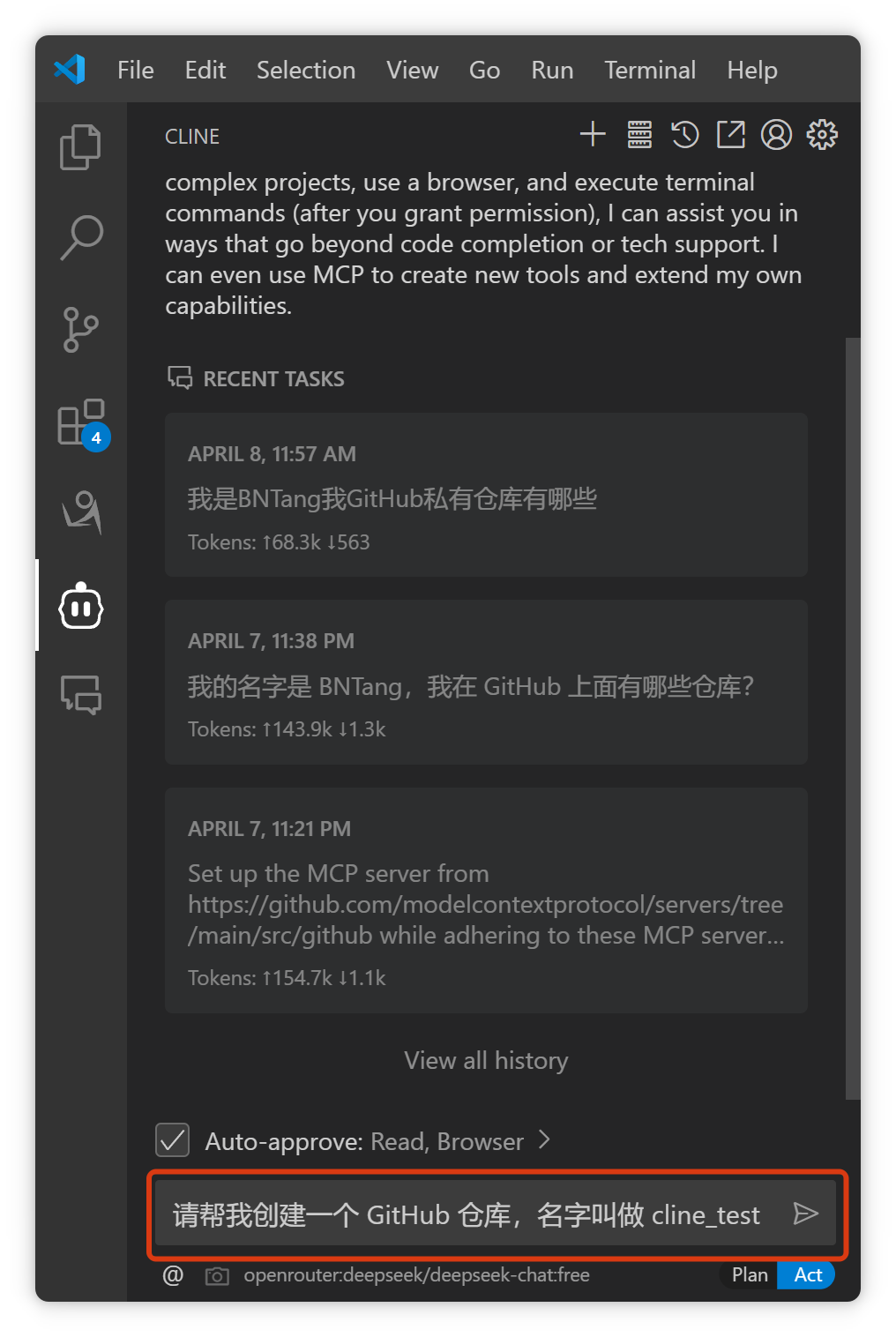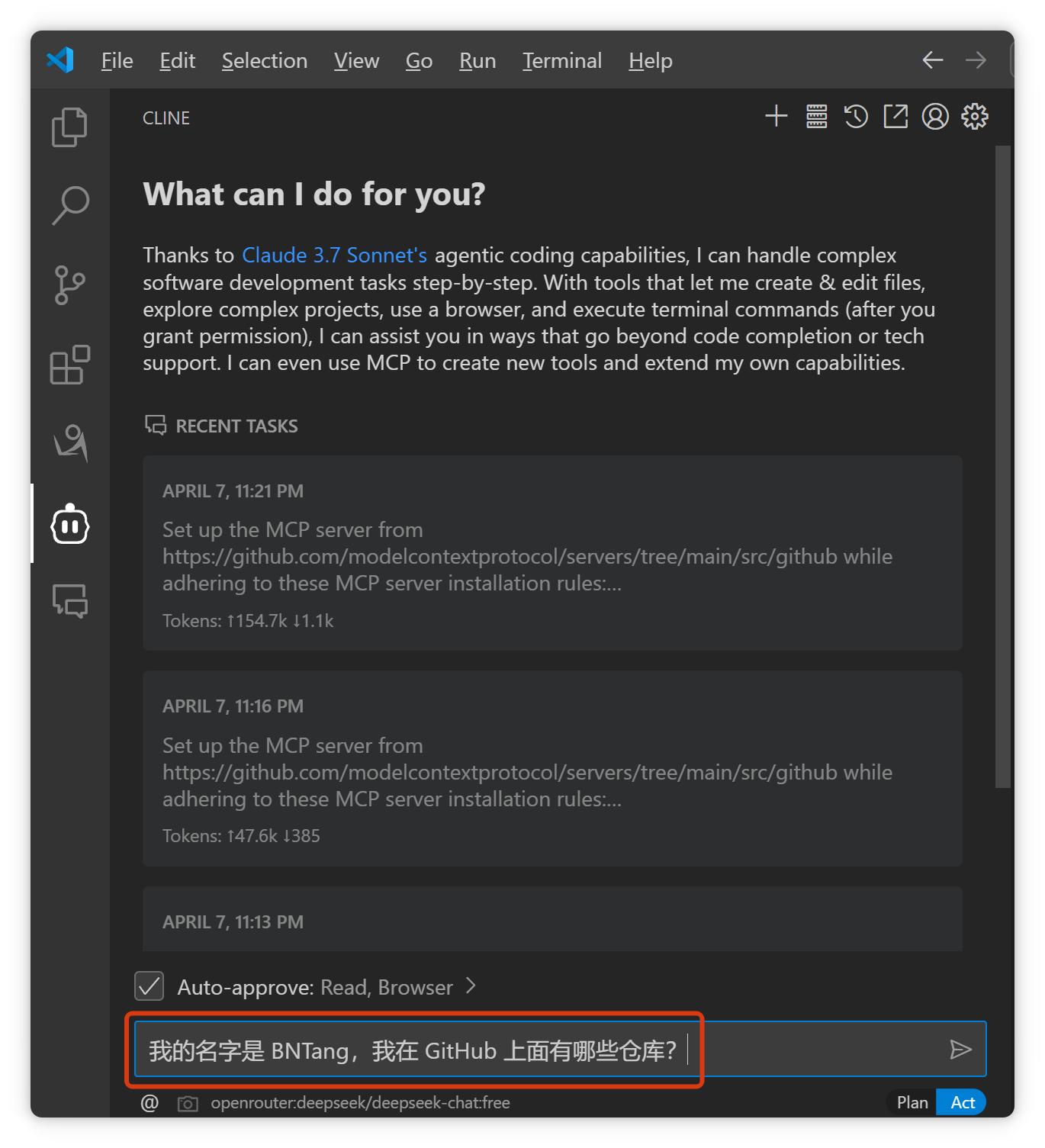 第七步:测试 MCP Server 功能,新建对话框,切换到 Act 模式,输入测试问题: