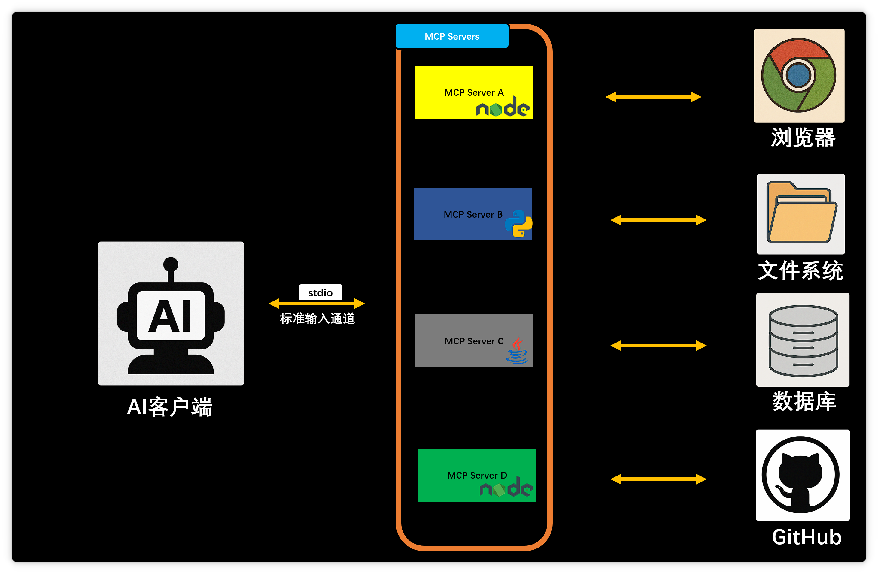 MCP Server 通常是一个在本地运行的程序,可能是用 Node.js 或 Python 开发的。