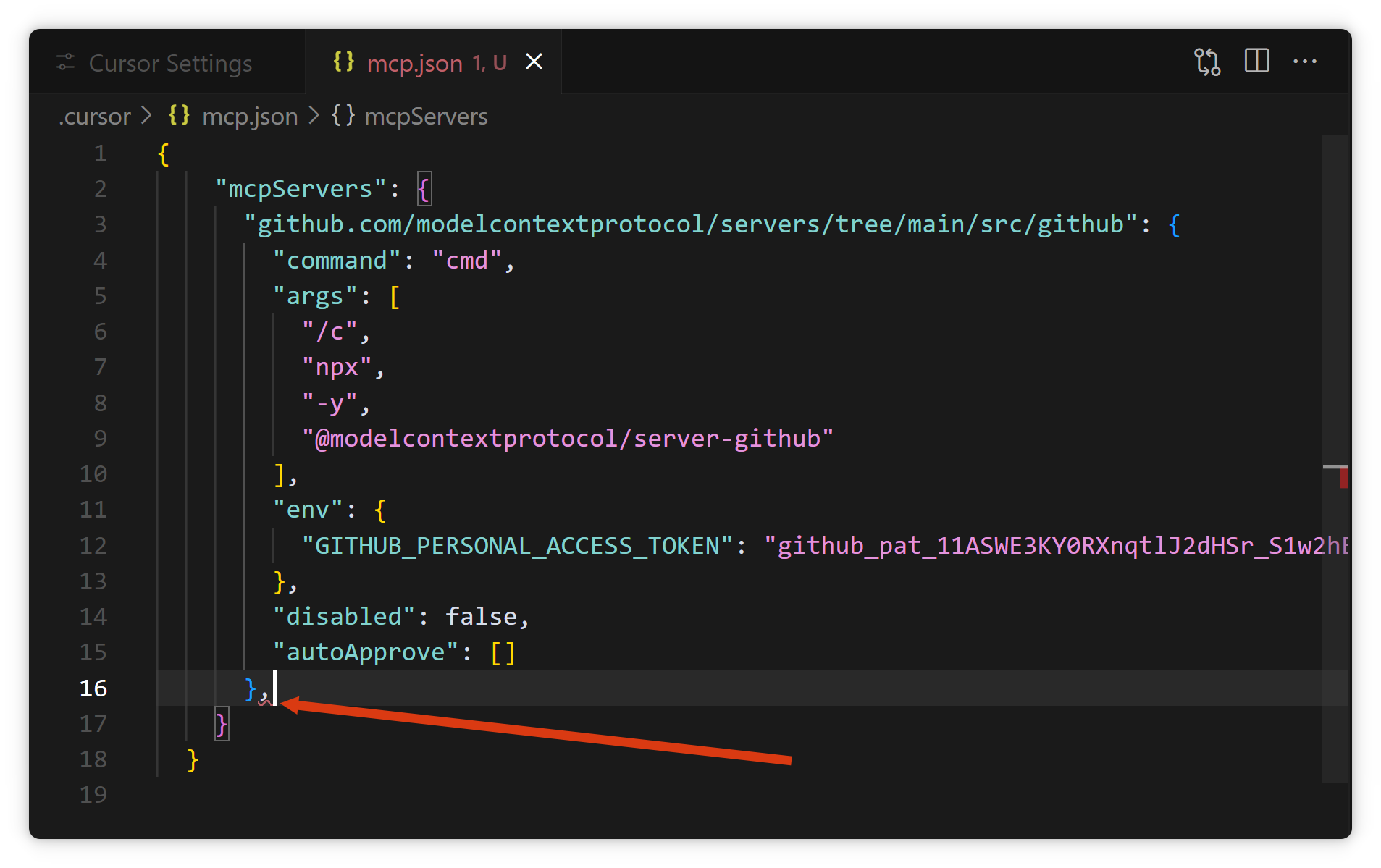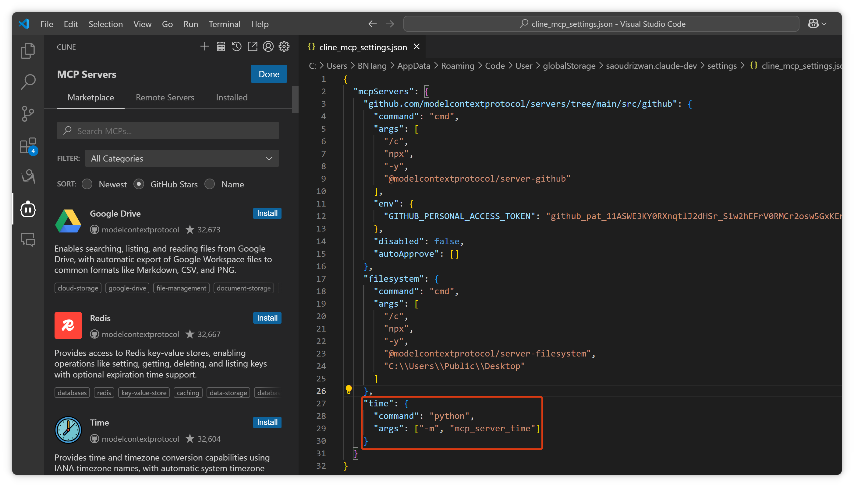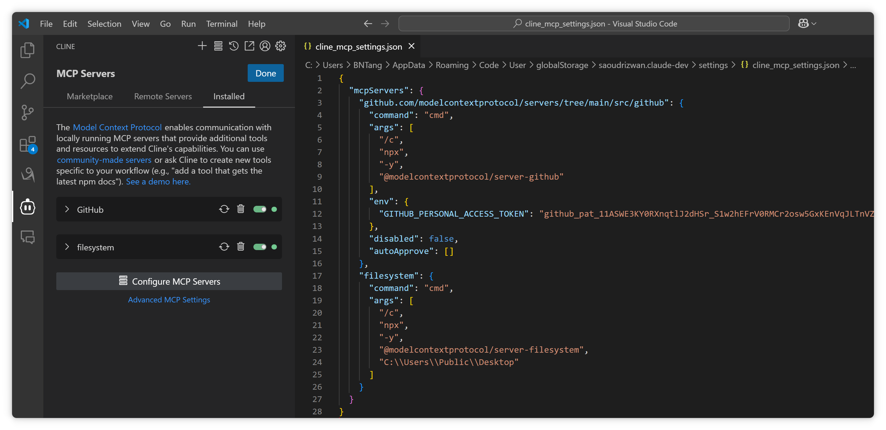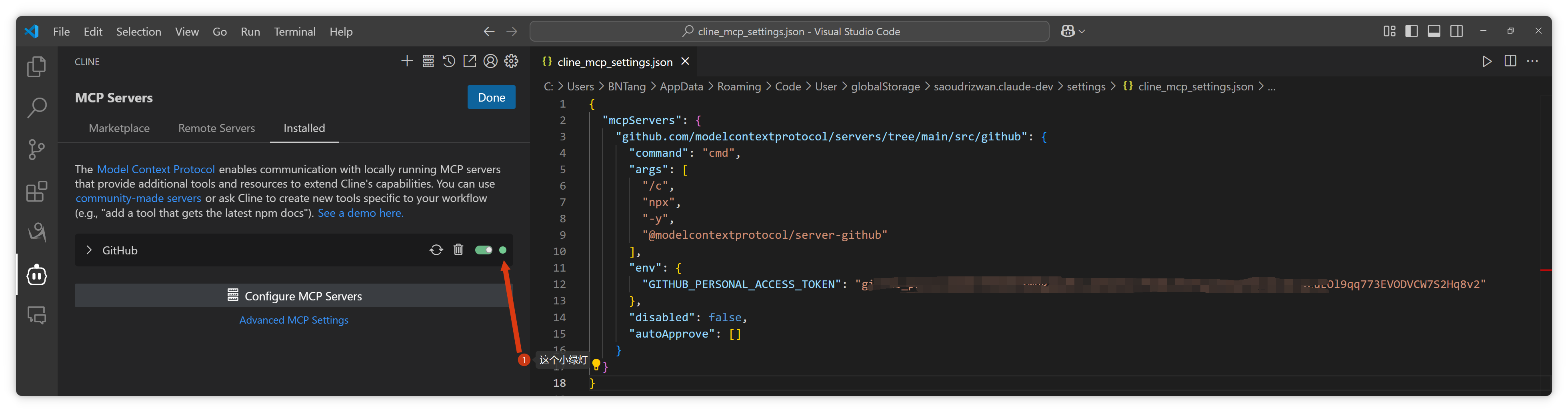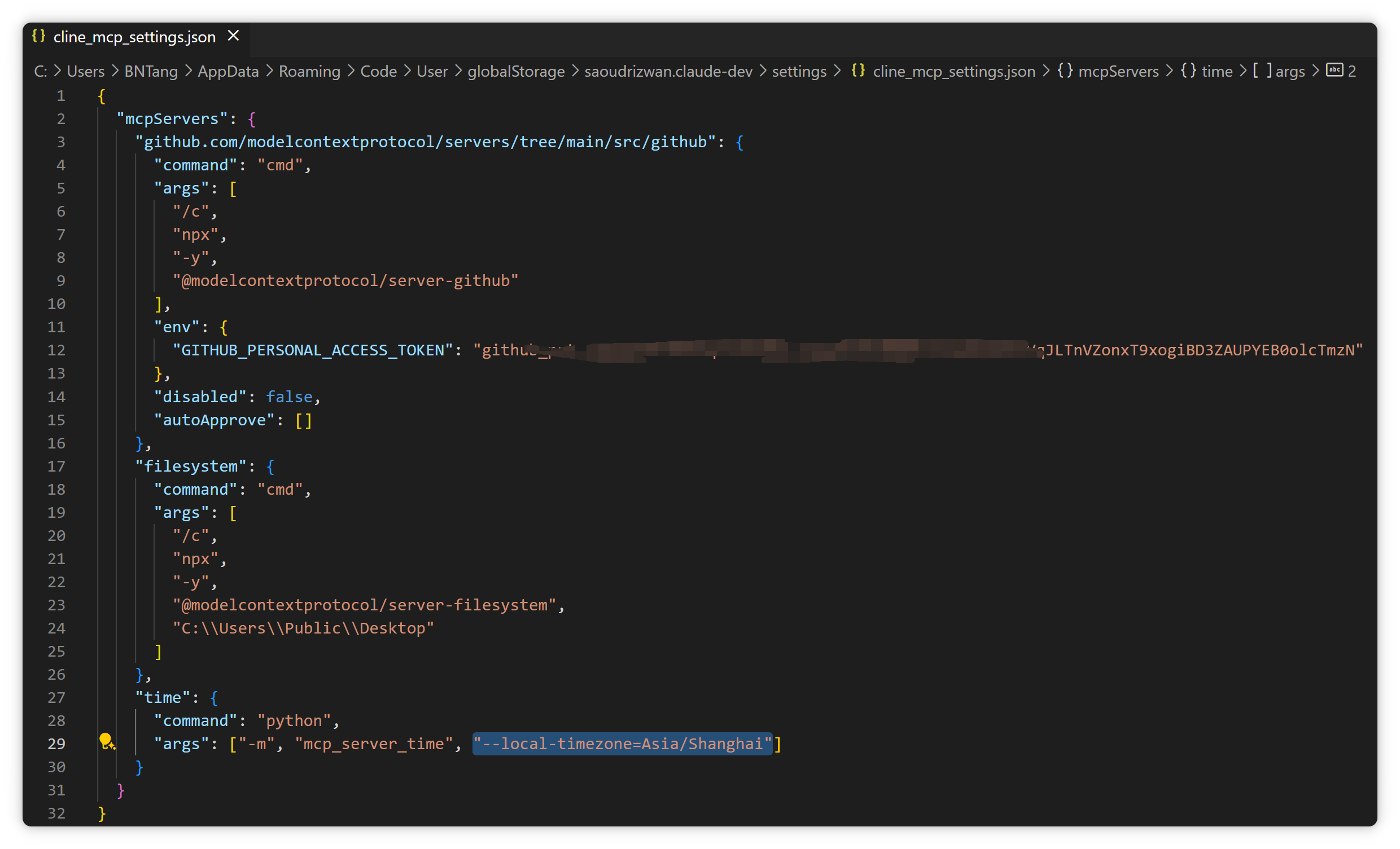 }打开 Cline 的 MCP 配置文件 cline_mcp_settings.json,将上述配置添加到 "mcpServers" 中,注意逗号: