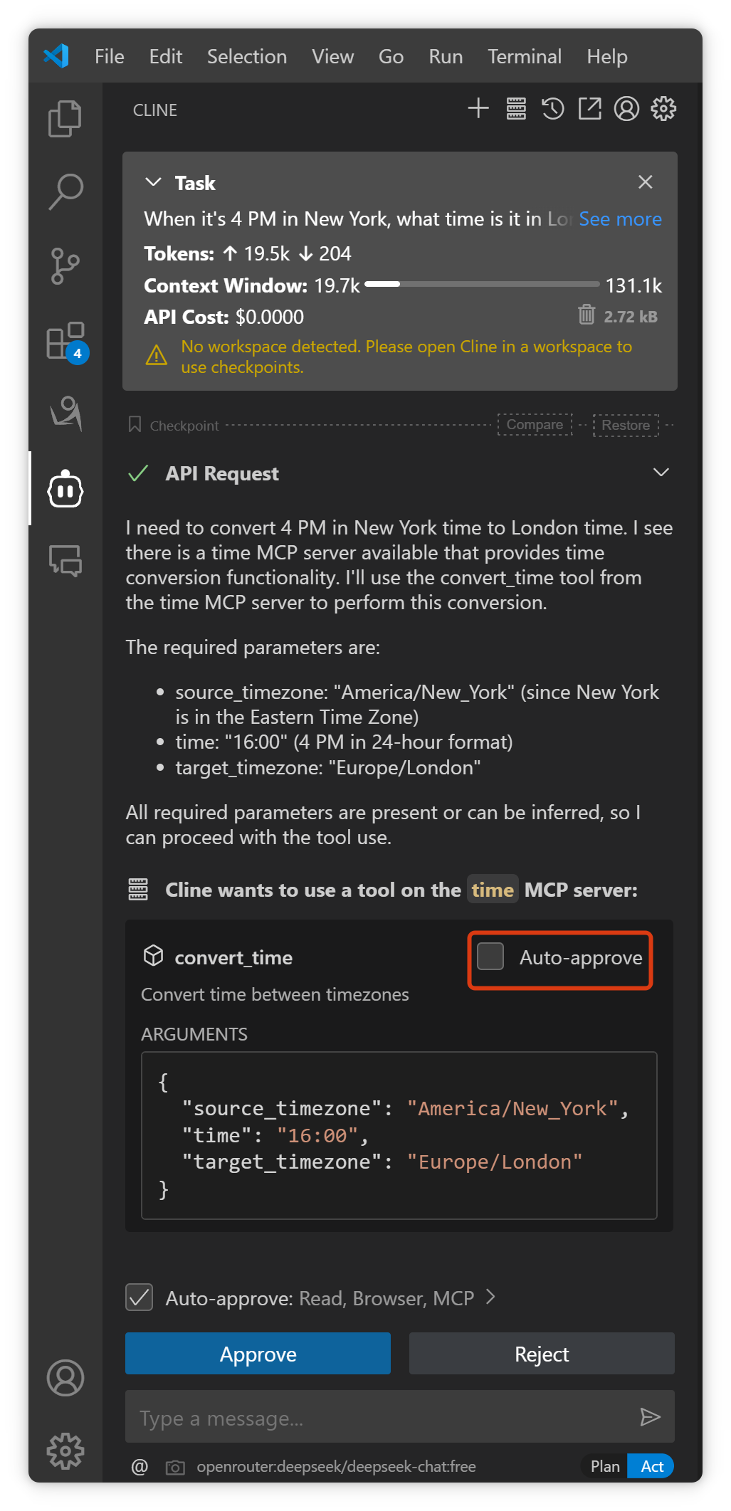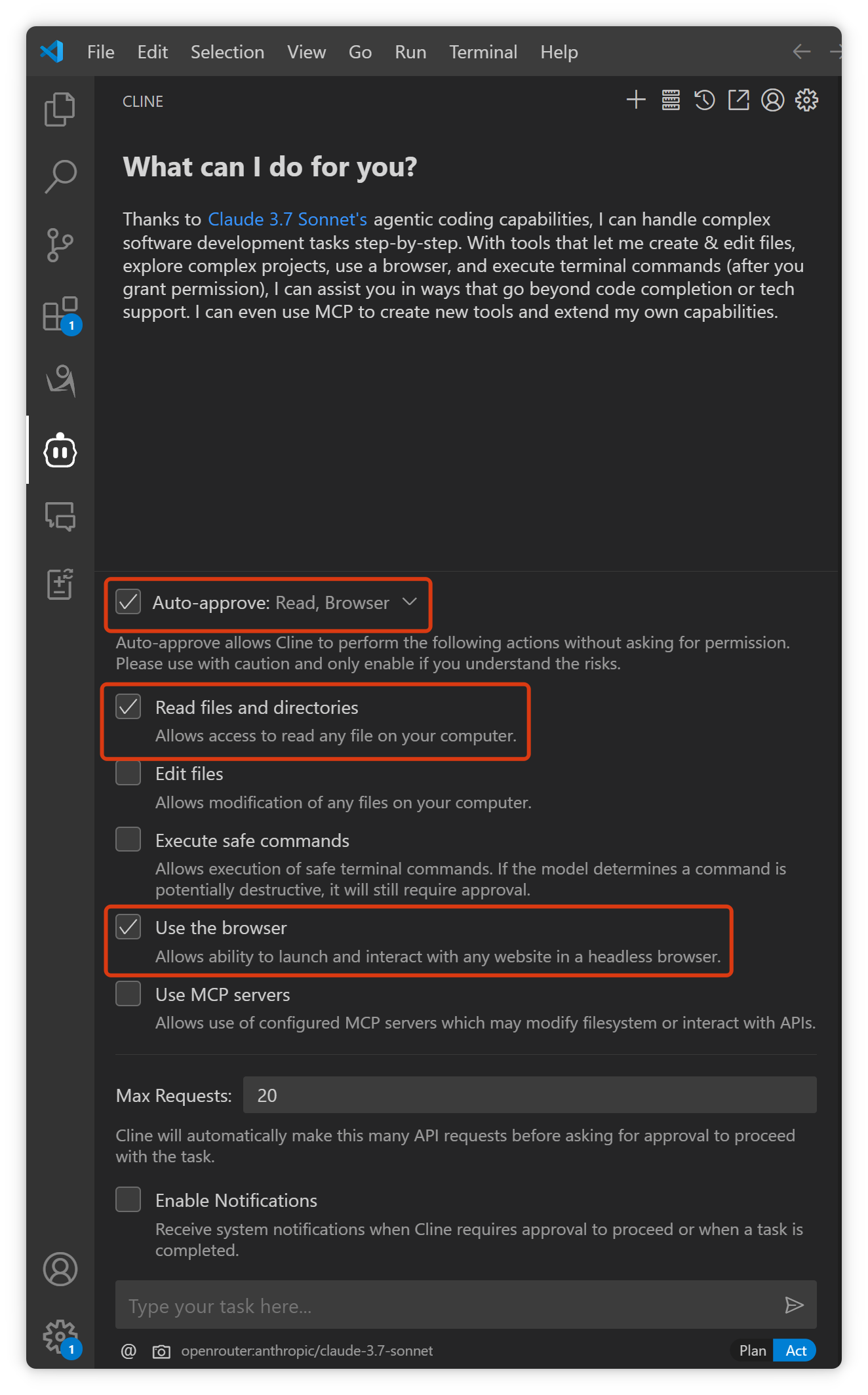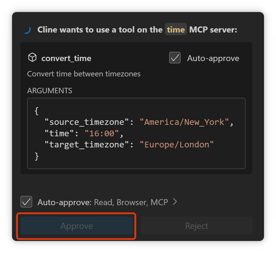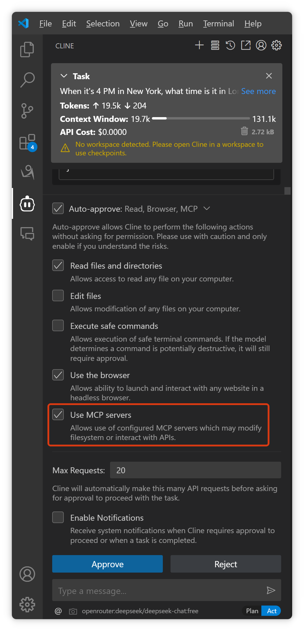首次使用时,Cline 将请求调用 MCP 权限。若想避免每次询问,可在 Cline 设置 中勾选: