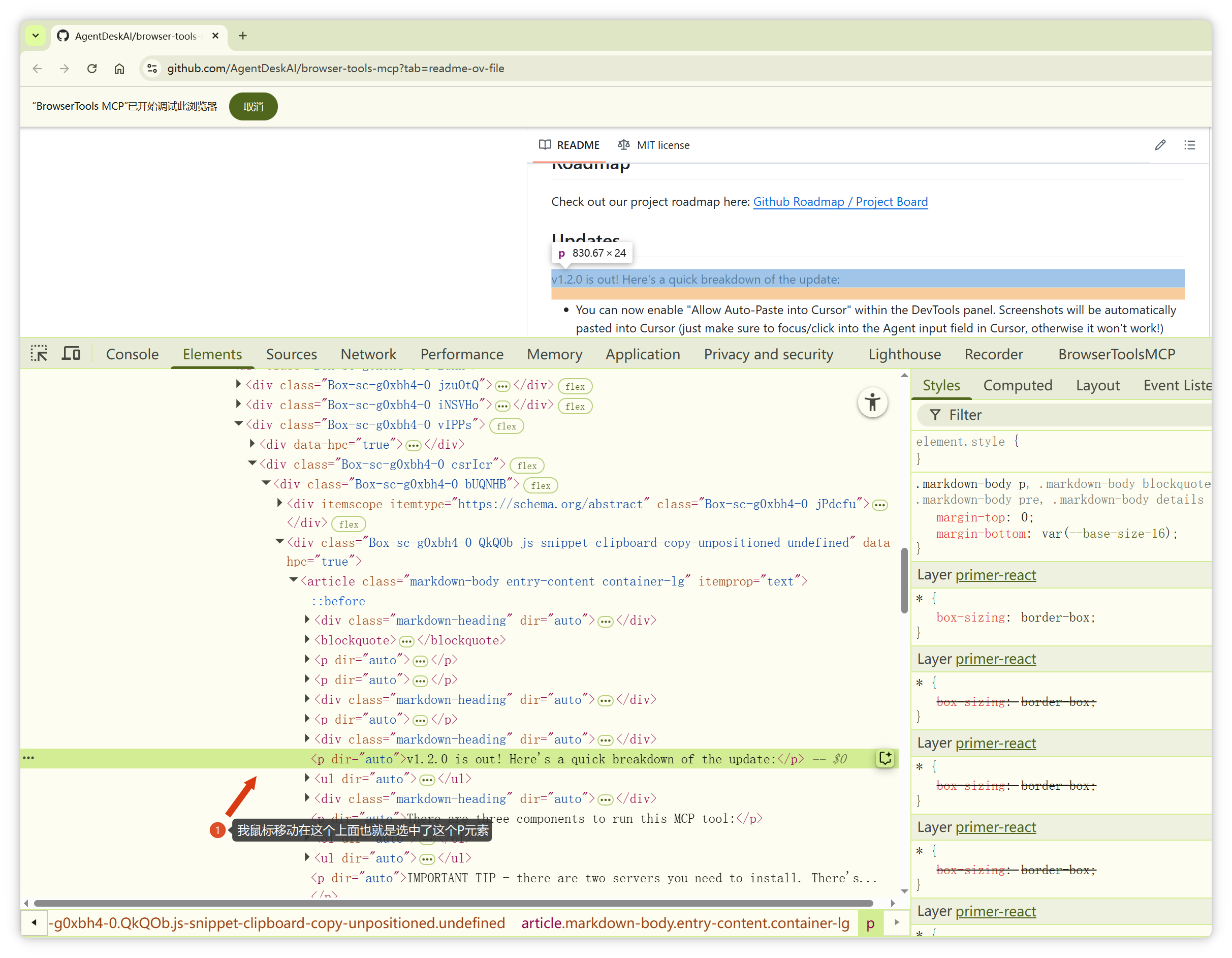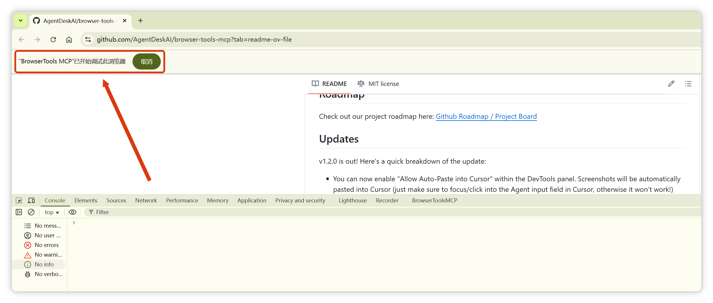 接着,我们打开浏览器,按下 F12 打开开发者工具,此时浏览器会提示:“BrowserTools MCP 已经开始调试此浏览器”: