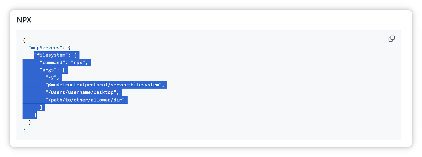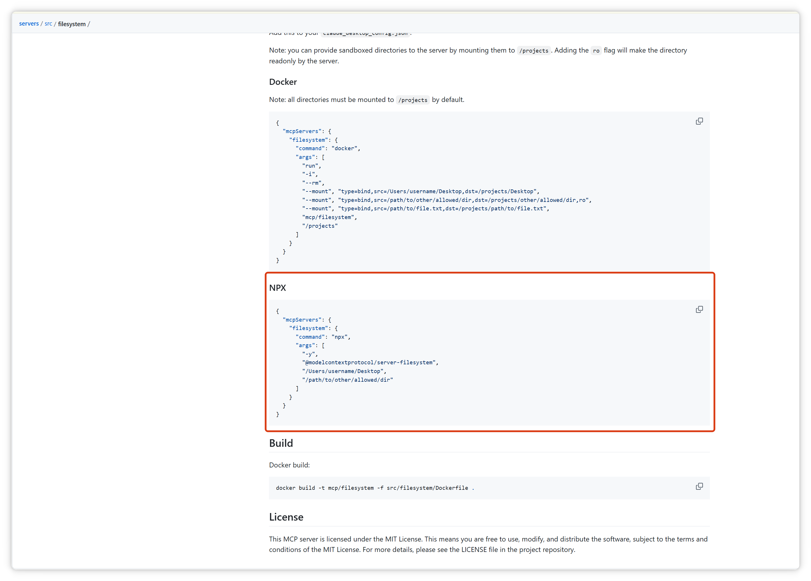 接下来,我们回到 GitHub 页面,复制以 MCP 结尾的 npx 命令:
