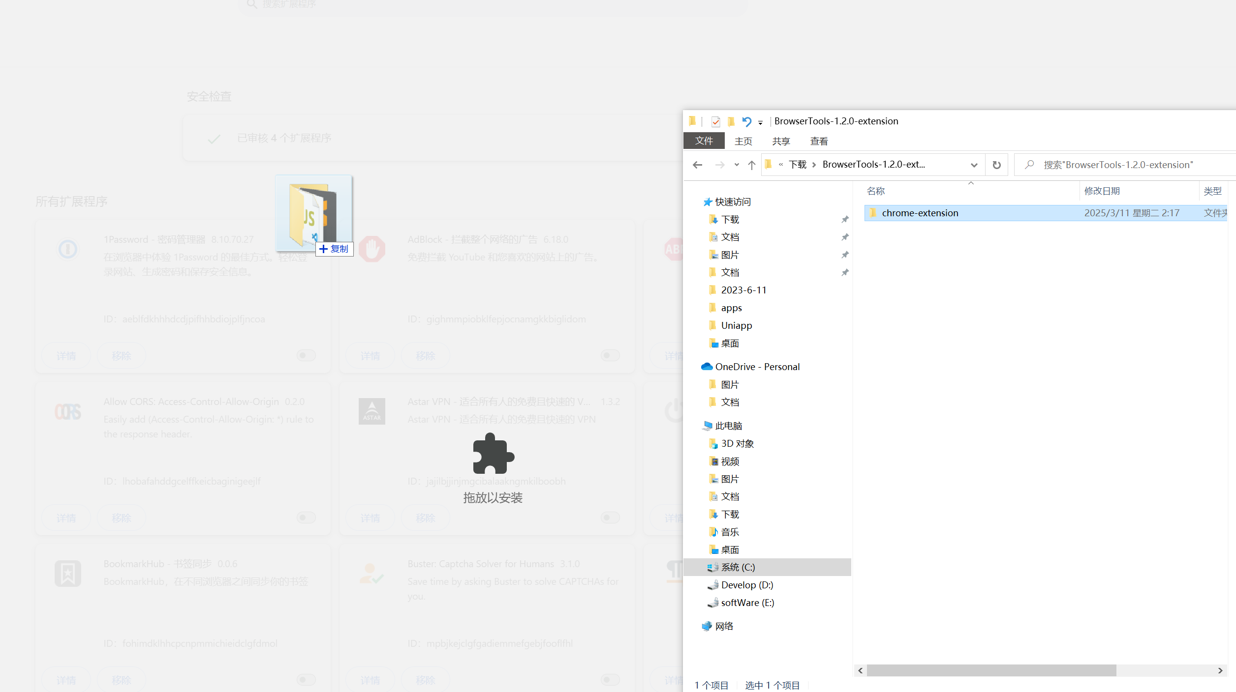 然后,将刚刚下载的插件解压到本地,进入解压后的文件夹,将其中的 chrome-extension 文件夹拖拽到浏览器的扩展程序页面中: