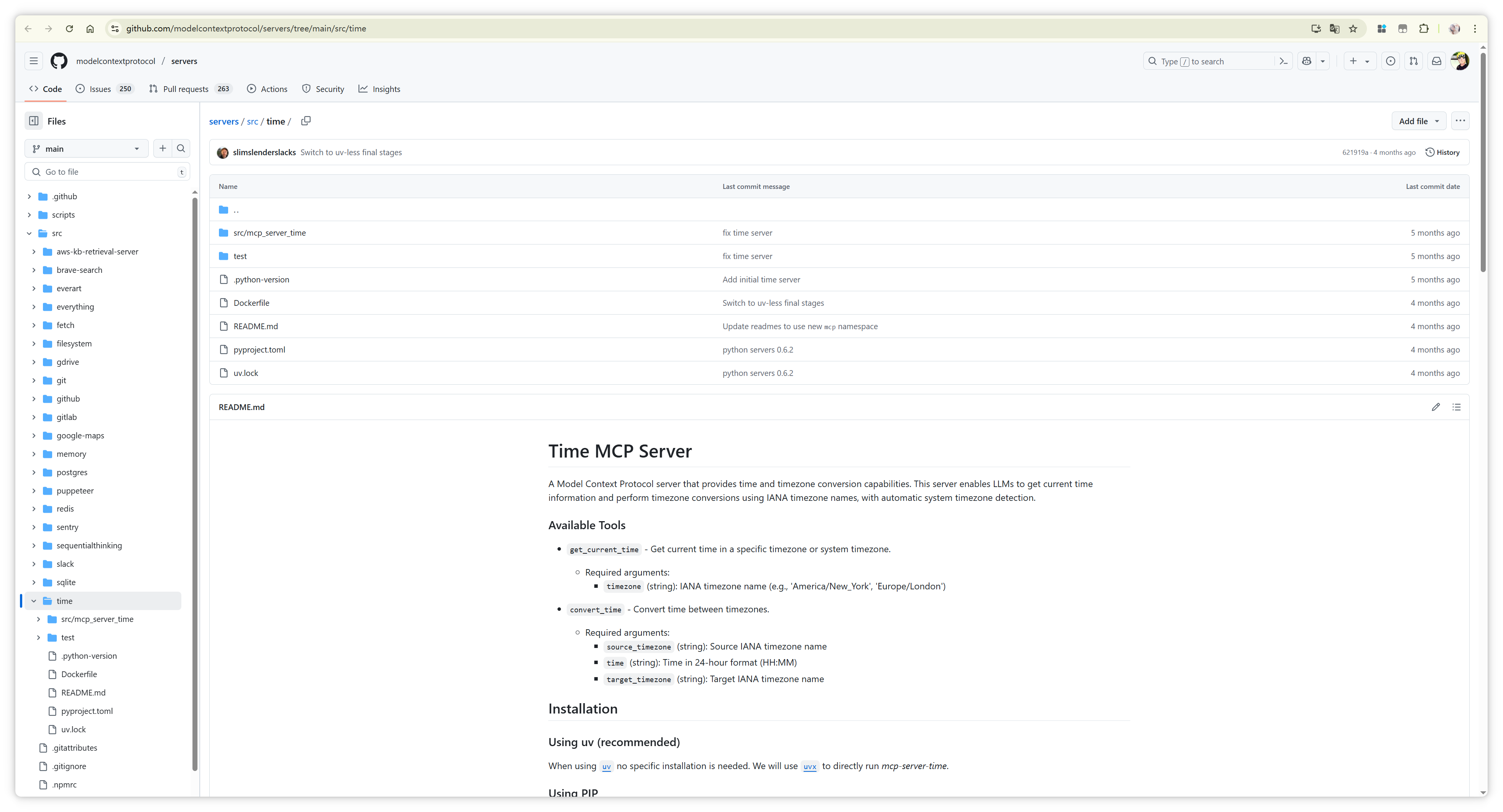 这里我们以一个特殊的 MCP Server time 为例,展示如何安装和配置使用 Python 编写的 MCP Server。