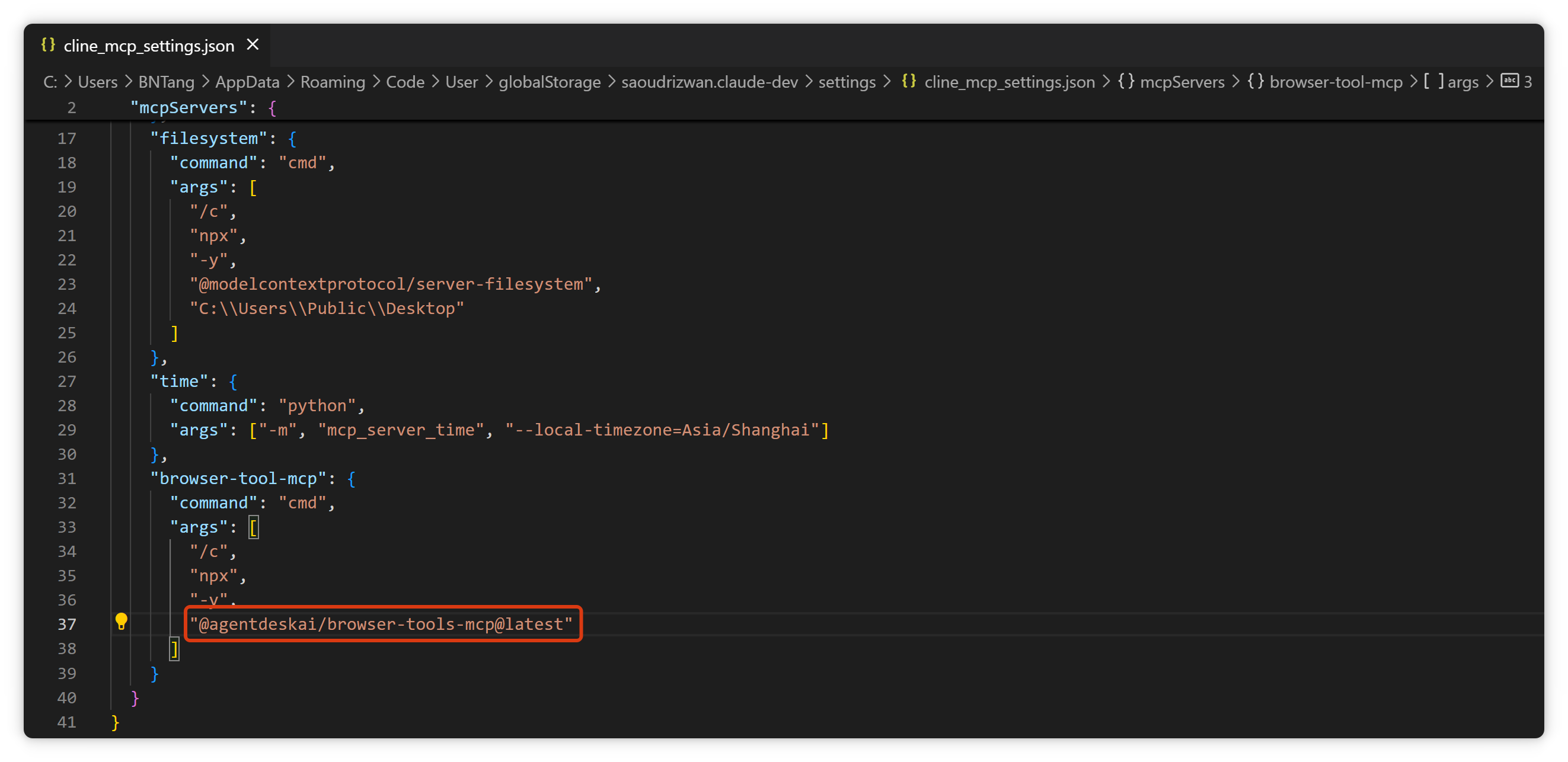 @agentdeskai/browser-tools-mcp@latest将此命令粘贴到 args 中: