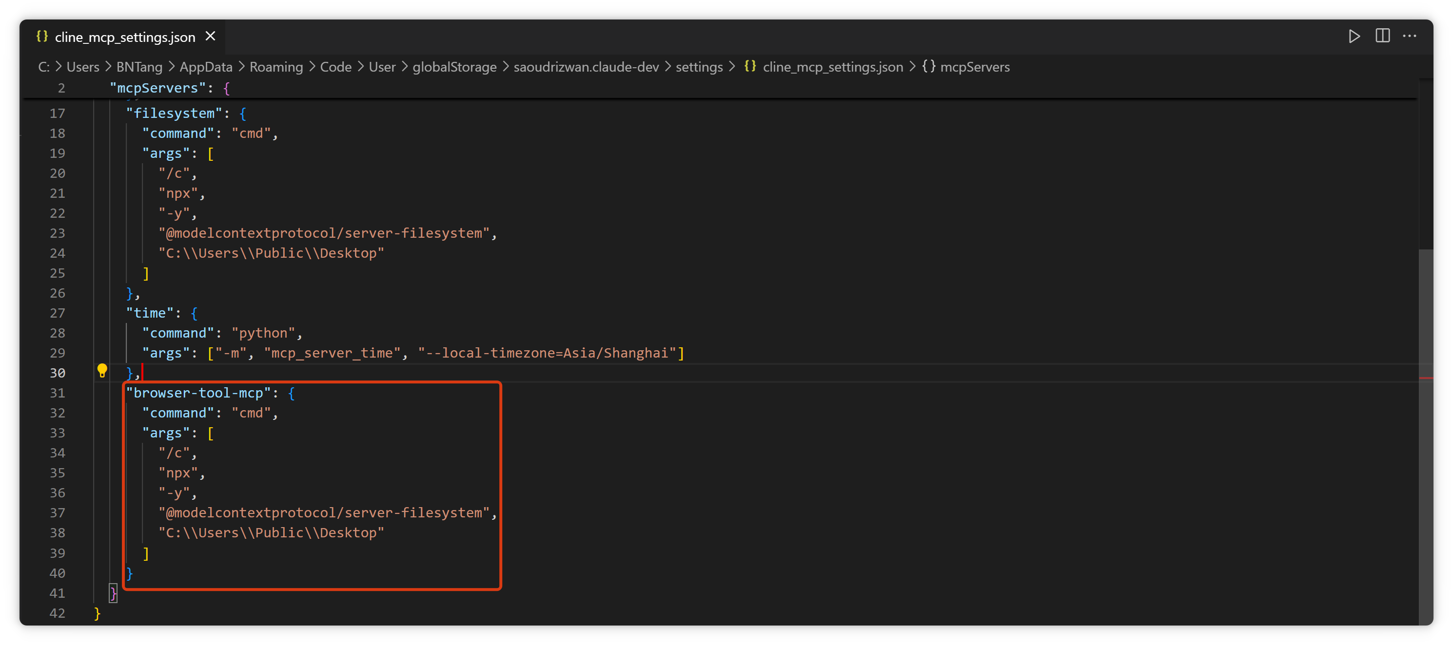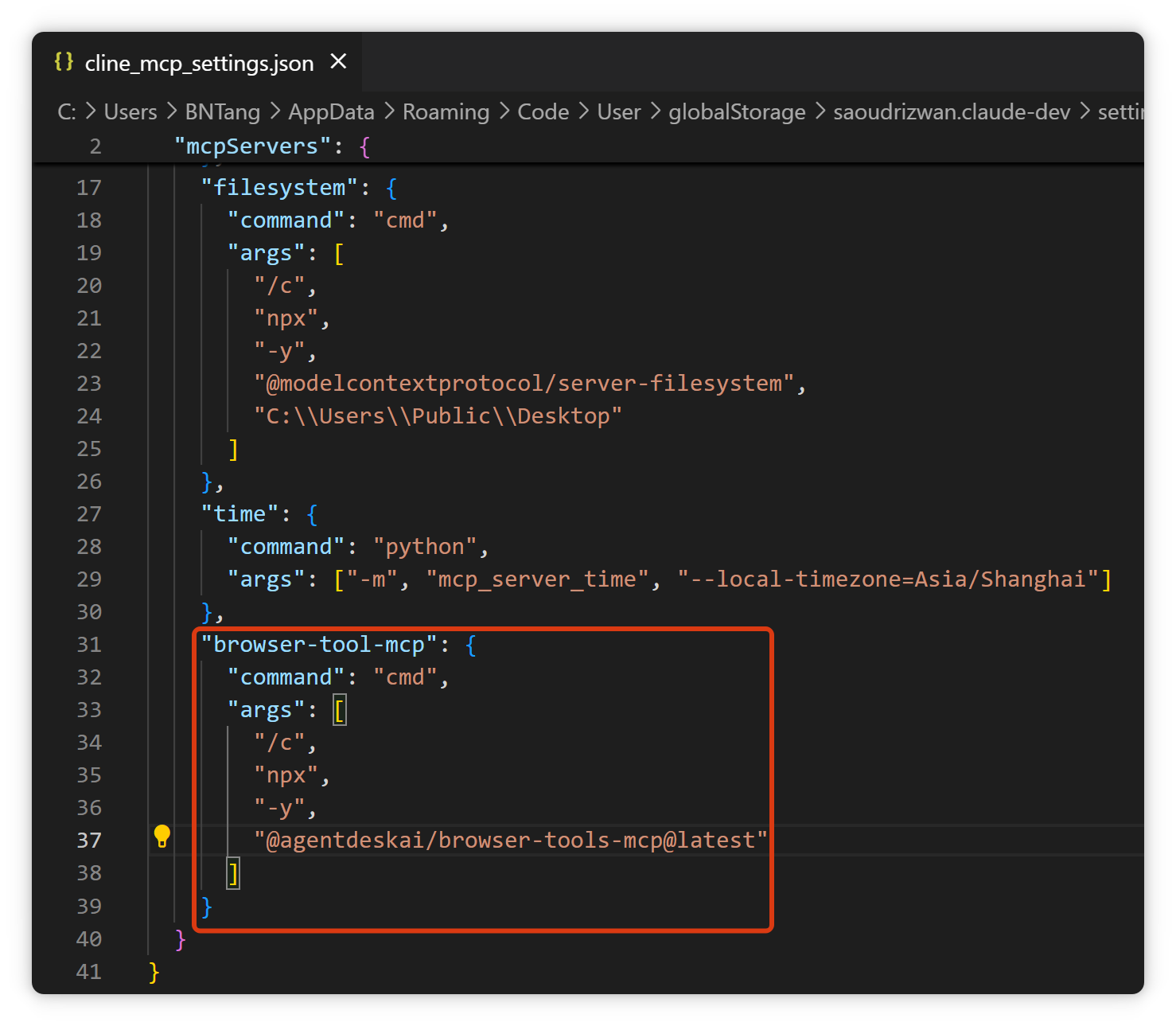 插件安装完成后,我们正式安装 Browser Tool 这个 MCP 工具。这里我们依旧使用 npx 安装方式。我仿照之前的配置,在 Cline 中新建一个配置项,将之前的 file system 配置复制一份,并将名称修改为 browser-tool-mcp: